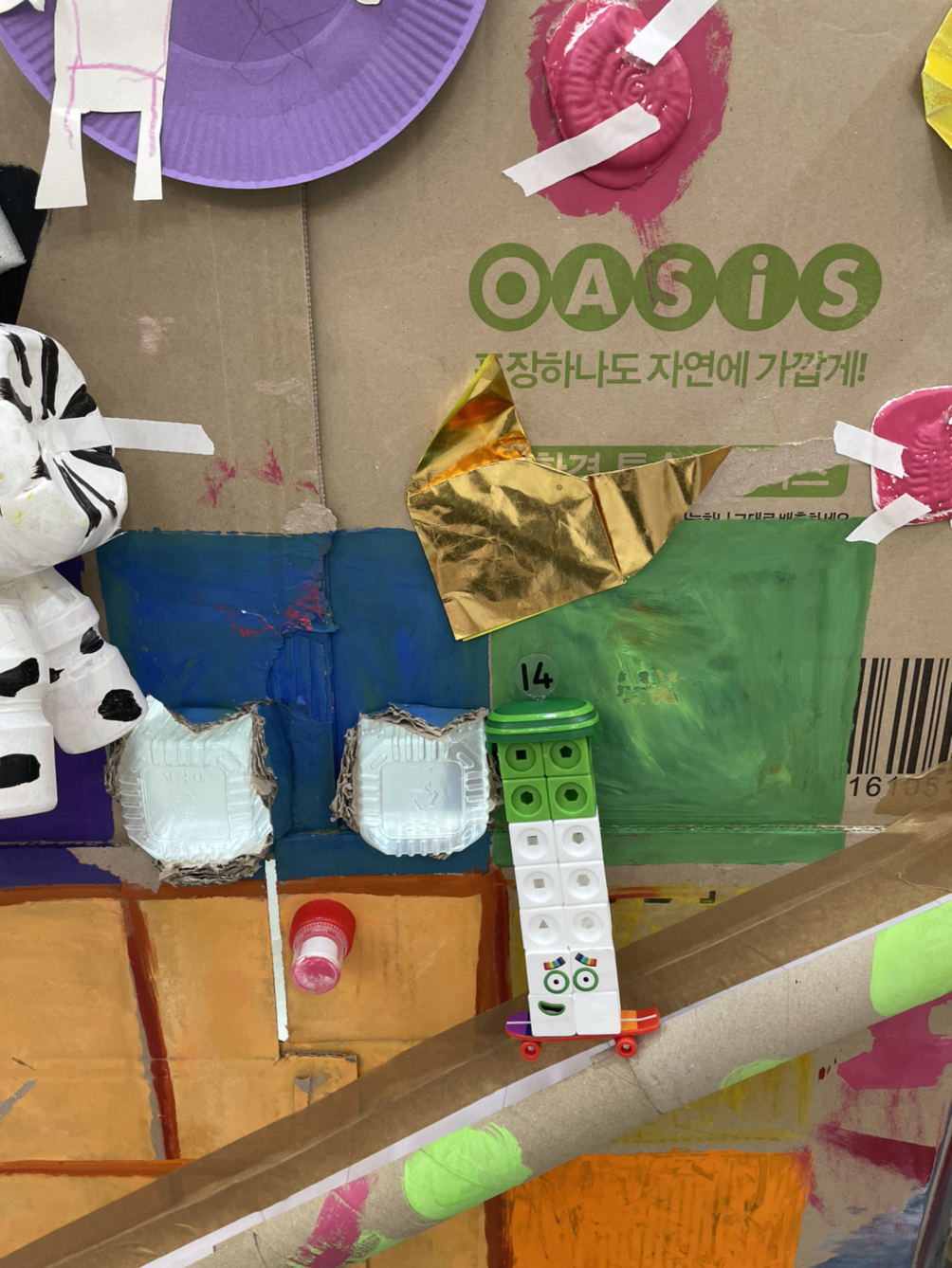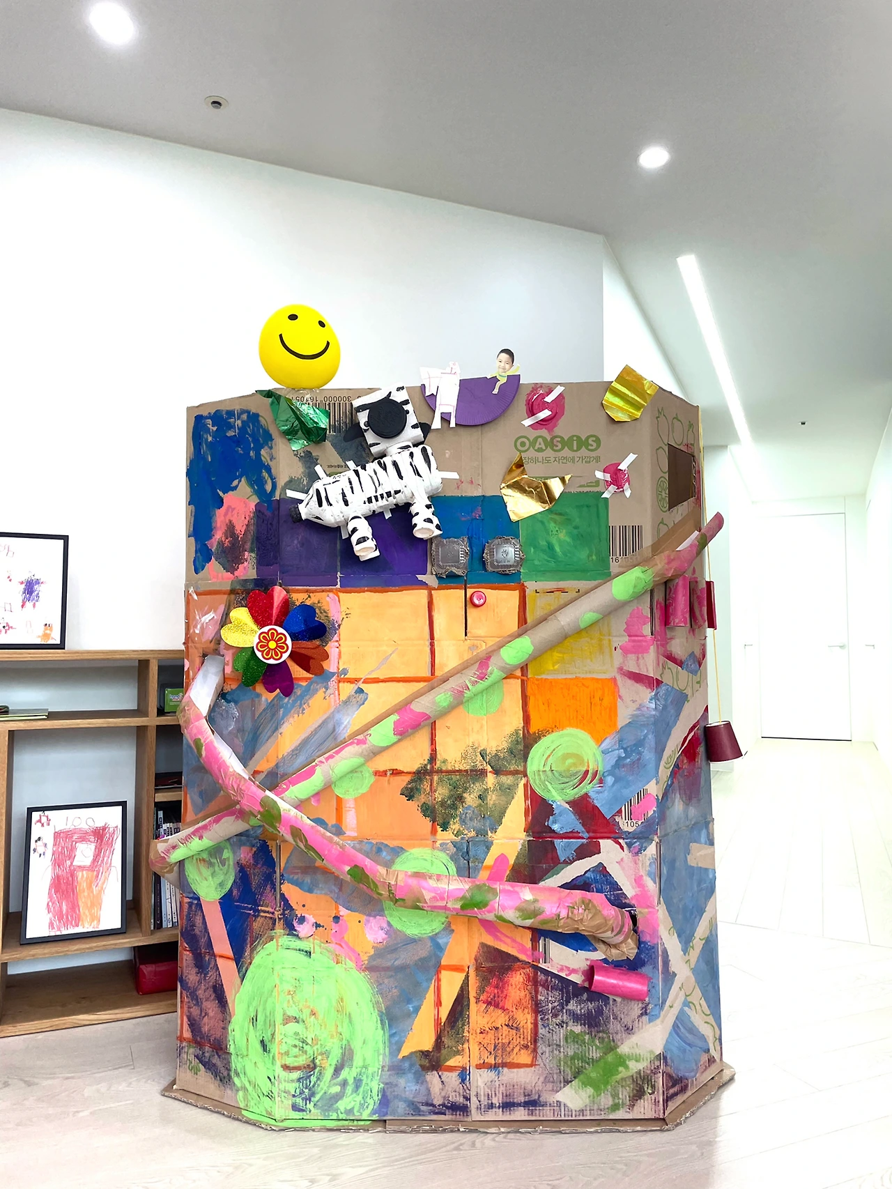 페인팅된 상자를 세워서 키오스크 공간이 되게 모양을 고정시켰다. 겉면의 러프한 칠 위에 동적인 재미를 가미하고 싶었다. 모아둔 키친타월심과 휴지심을 모조리 꺼내서 긴 길이 되게 이었다. 키오스크 왼쪽 옆면에서 시작해 오른쪽 옆면으로 통하는 길 하나, 반대로 오른쪽 옆면에서 왼쪽 옆면으로 가는 길 또 하나를 만들었다. 키오스크 안에서 손 내밀어 자동차를 굴리면 반대편으로 내려와서 다시 안으로 쏙 들어갔다. 양쪽에서 동시에 굴리기도 했다. 굴려보고 싶은 건 아무거나 다 굴렸다.