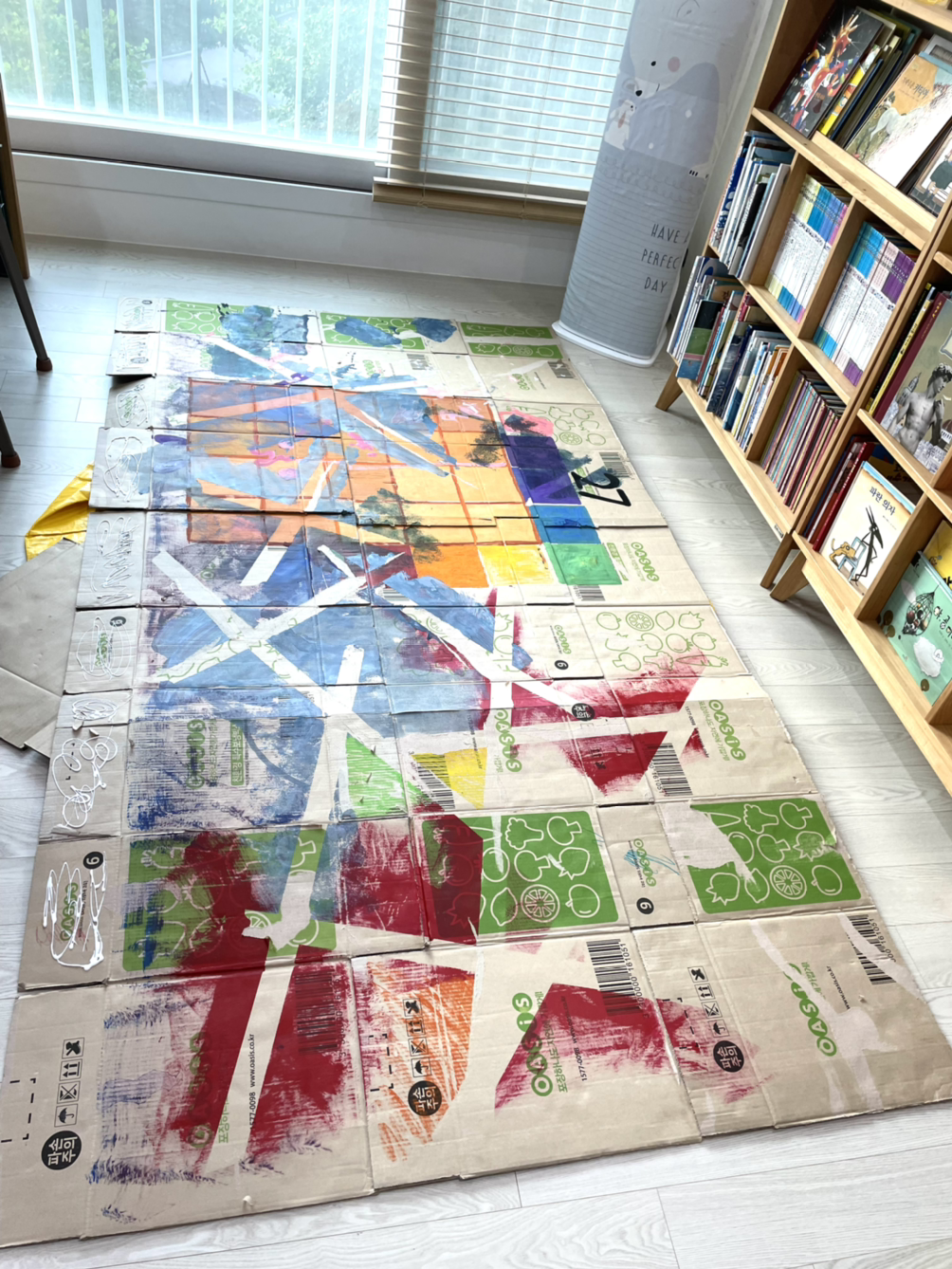 거실에 들어찬 상자는 일종의 캔버스였다. 그 위에 테이핑 아트(taping art)를 해보기로 했다. 너비 5cm쯤 되는 넓은 마스킹 테이프를 여러 방향으로 붙여서 화면을 구성했다. 테이핑 된 상자 표면에 물감 묻힌 롤러를 문질렀다. 마지막으로 테이프를 떼면 가려졌던 자리를 제외한 나머지 구역에 색이 덮여 있었다. 아이에게 선, 면, 색을 감각적으로 구성하는 눈을 키워줄 수 있는 활동이었다.