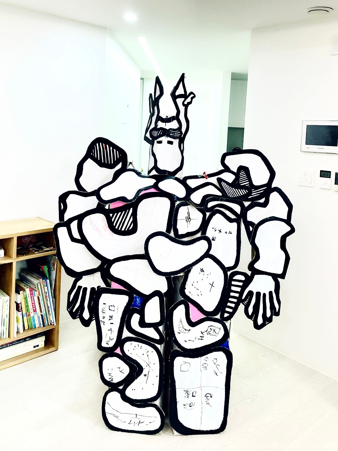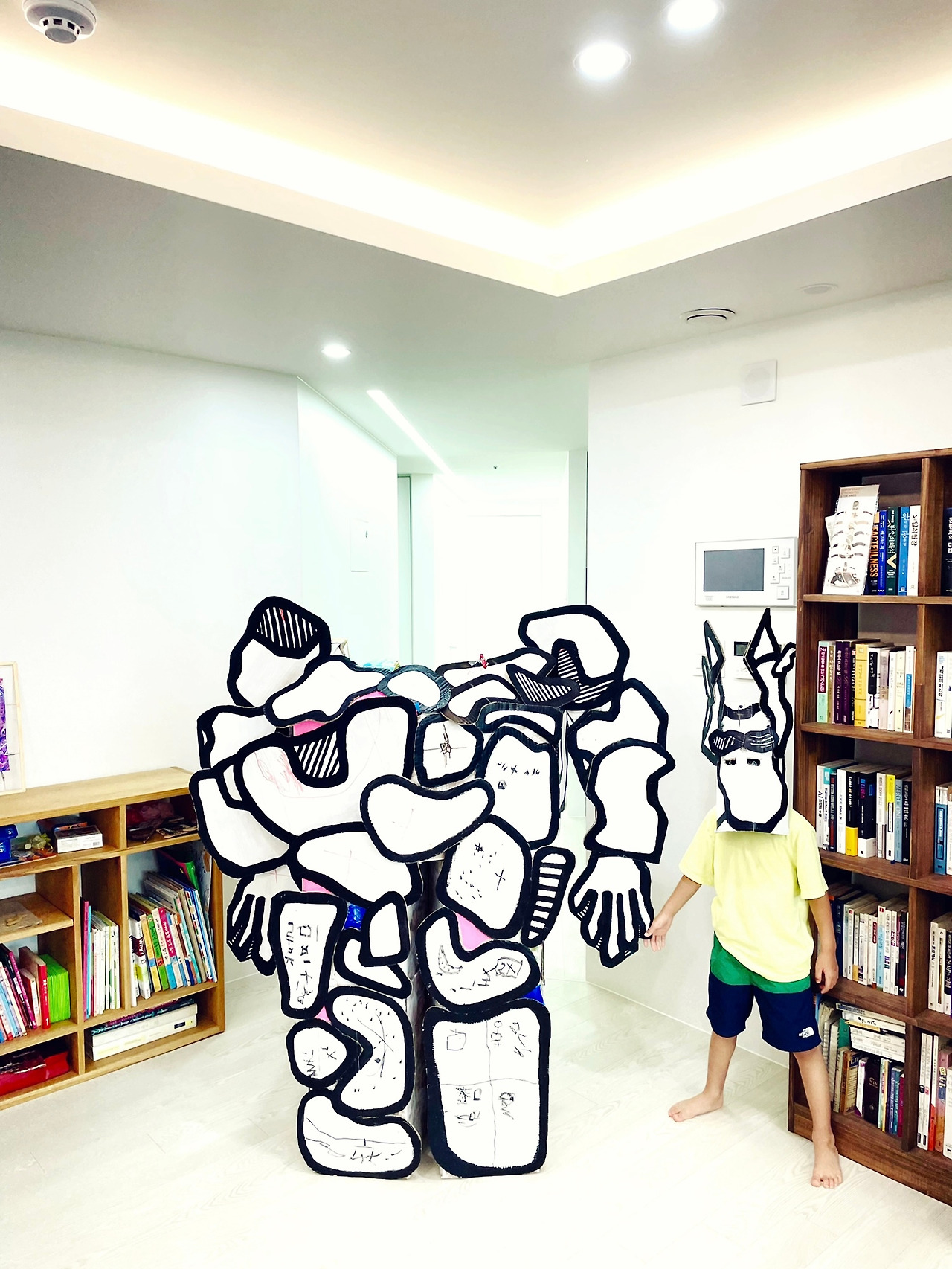 그때 본 '서 있는 야수상'을 머릿속에서 소환해냈다. 여기에 더해서 작가의 작품 세계를 조사하는데 얼마간의 시간을 할애했다. 아이와 뒤뷔페의 작품을 들여다보며 우리만의 로봇도 만들어 나갔다. 본능에 충실한, 규격화되지 않은 거대한 존재를 시각화했다. 흰색으로 칠한 면 위에 검은색으로 그은 선. 다시 흰색, 검은색, 흰색, 검은색. 계획도 의도도 없는 반복적인 행위가 잡념을 없애 줬다. 아이에게 작품 위에 마음대로 낙서하라고 했다. 작품을 손대지 말아야 할 어려운 대상으로 보지 않게 하고 싶었다. 처음에는 그렇게 해도 돼?,라고 묻더니 어느 순간부터는 붓펜을 쥐고 제 맘대로 쓰고 그렸다.