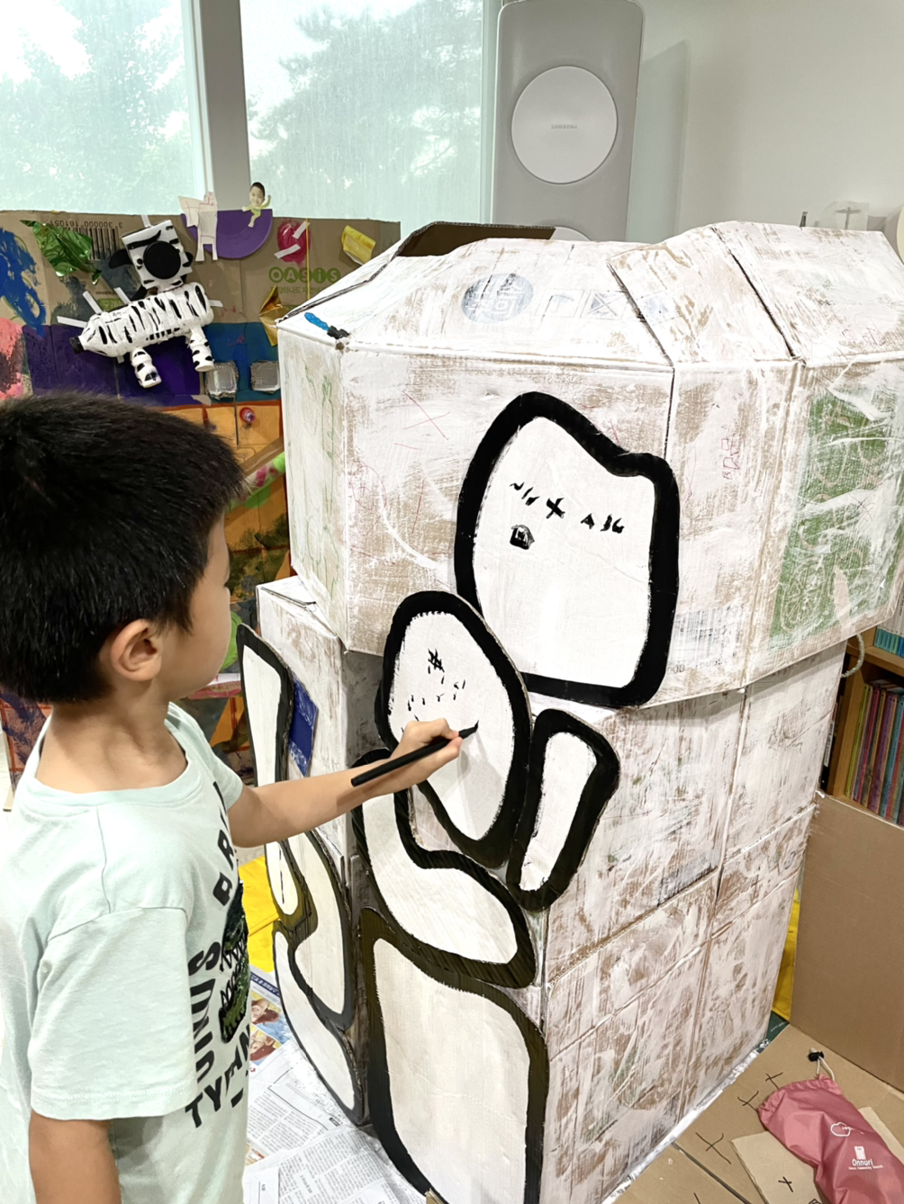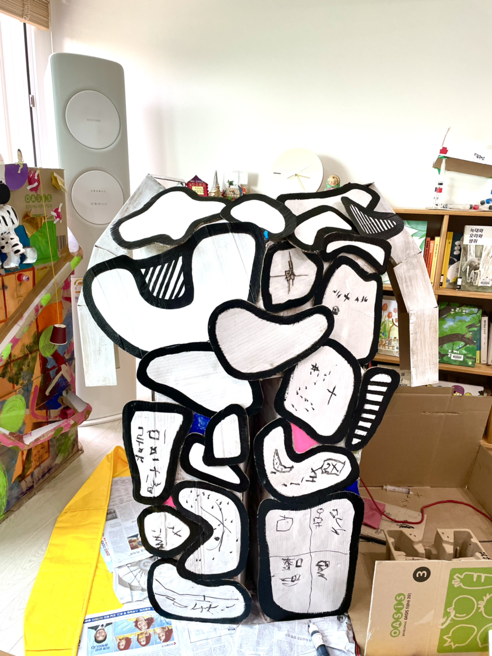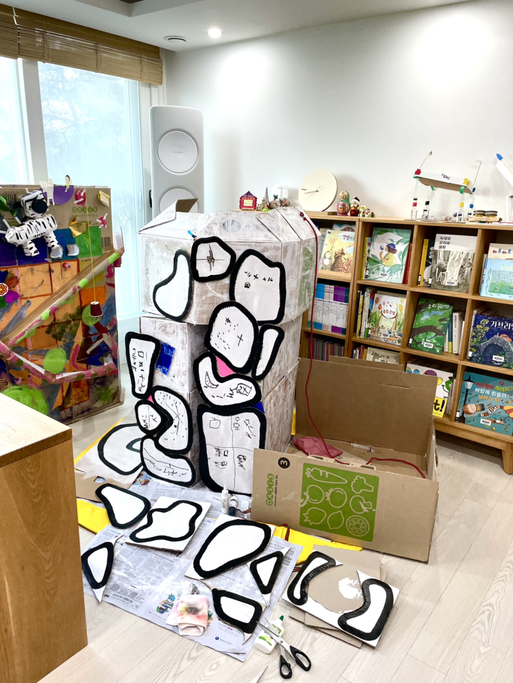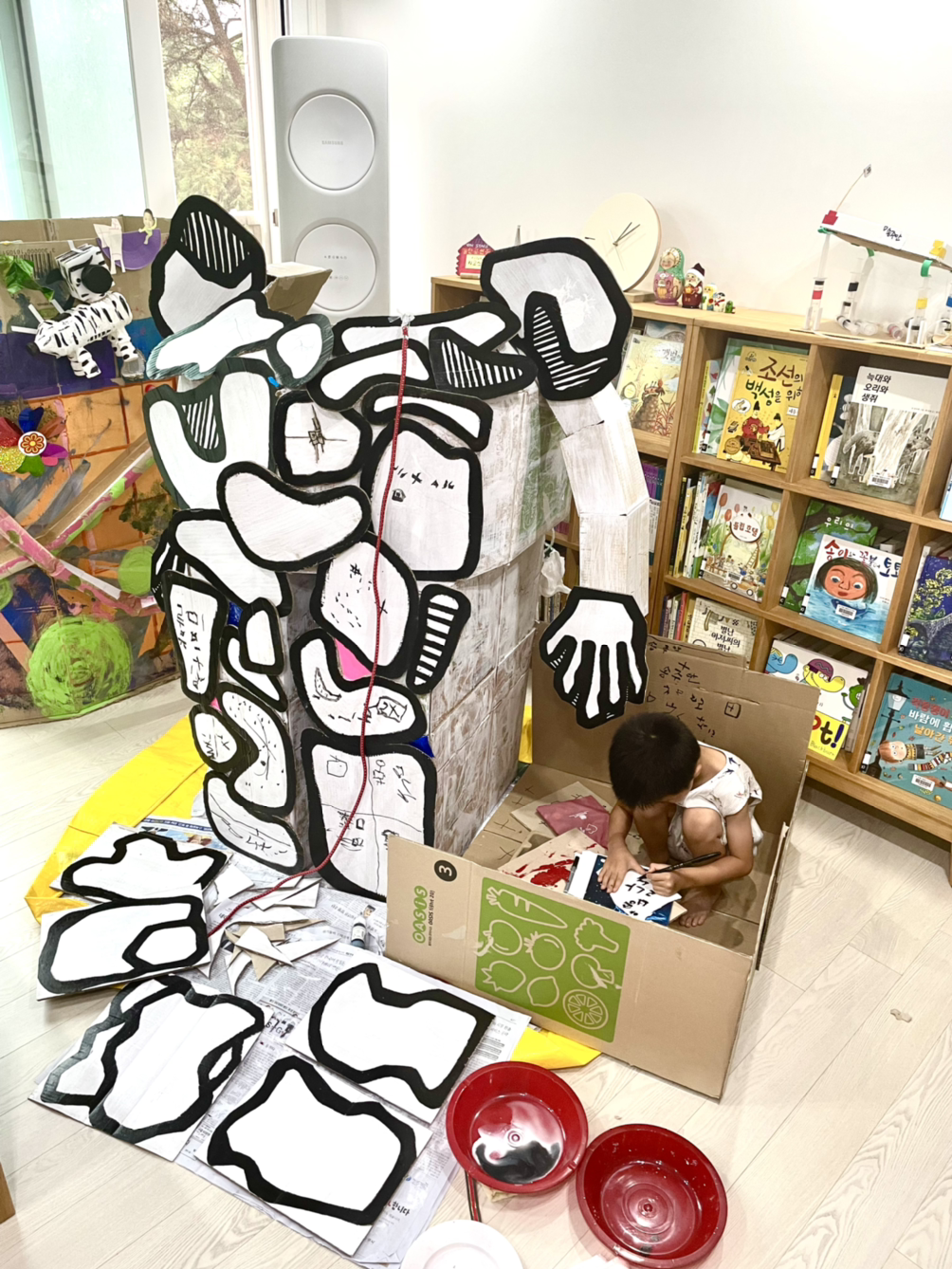 나와 아이의 택배 상자 작업은 구상부터 완성까지 대개 2~3주의 시간이 소요됐다. 캔버스 위에 그림을 그리는 평면 작업보다 긴 시간을 요하기 때문에 상자를 붙이는 작업은 아이가 하원하기 전에 해놓곤 했다. 그 과정까지도 아이와 함께 하면 좋겠지만, 우선은 아이가 이미 붙여진 상자면 위에 다양한 미술 기법과 재료를 실험해보고 미술사조를 이해하도록 돕는데 중점을 두기로 했다.