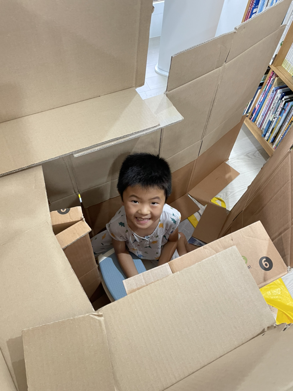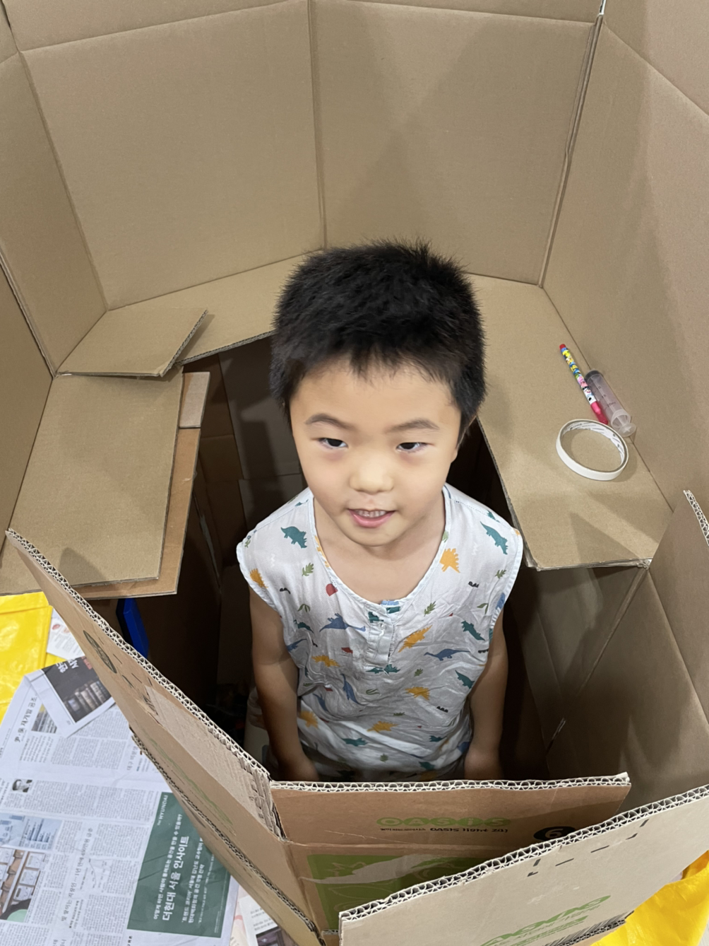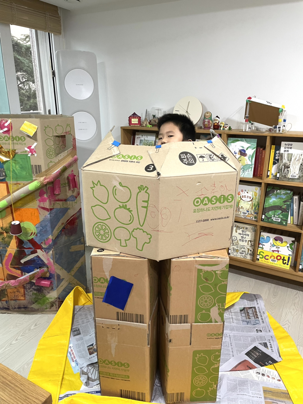 탑승한다는 느낌이 들려면 적어도 한 두 칸은 오를 수 있는 계단이 필요해 보였다. 그러려면 로봇이 아이 키보다 커야 했다. 1인용 본부 느낌이 날 만큼 아담한 사이즈의 공간도 마련돼야 했다. 완성될 크기를 어림 잡은 후 상자를 꺼냈다. 이번에도 사과 상자보다 1.5배 큰 것을 8개 꺼냈다. 늘 하던 데로 이음매를 뜯어 길게 펼친 후 접착제로 연결하는 작업부터 시작했다. 이 단계 때마다 거실 바닥이 상자로 가득 덮였다.