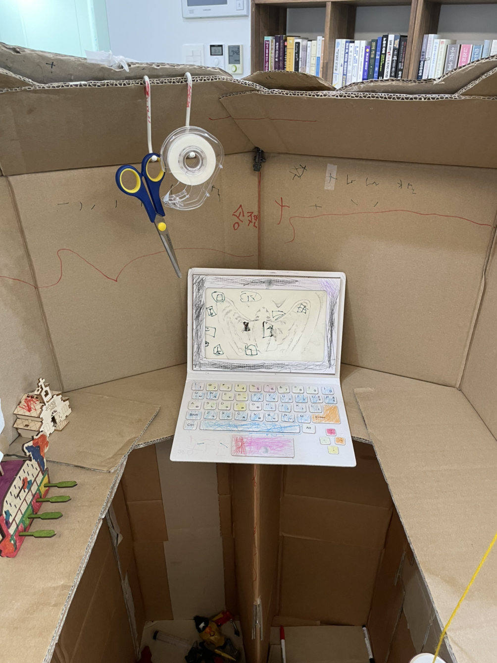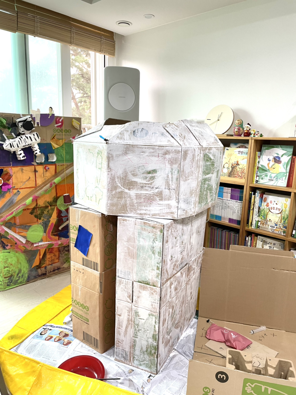 앞에서 봤을 때 로봇이 살짝 다리를 벌린 채 늠름하게 선 것처럼 보이게 상자를 접었다. 옆면과 뒷면도 만들어지게 접어서 1인실 규모의 방처럼 상자 벽을 둘러쳤다. 그 위에는 다리 부분에 쓰인 것보다 작은 상자 2개를 이어 붙여서 가슴 부위용으로 얹었다.