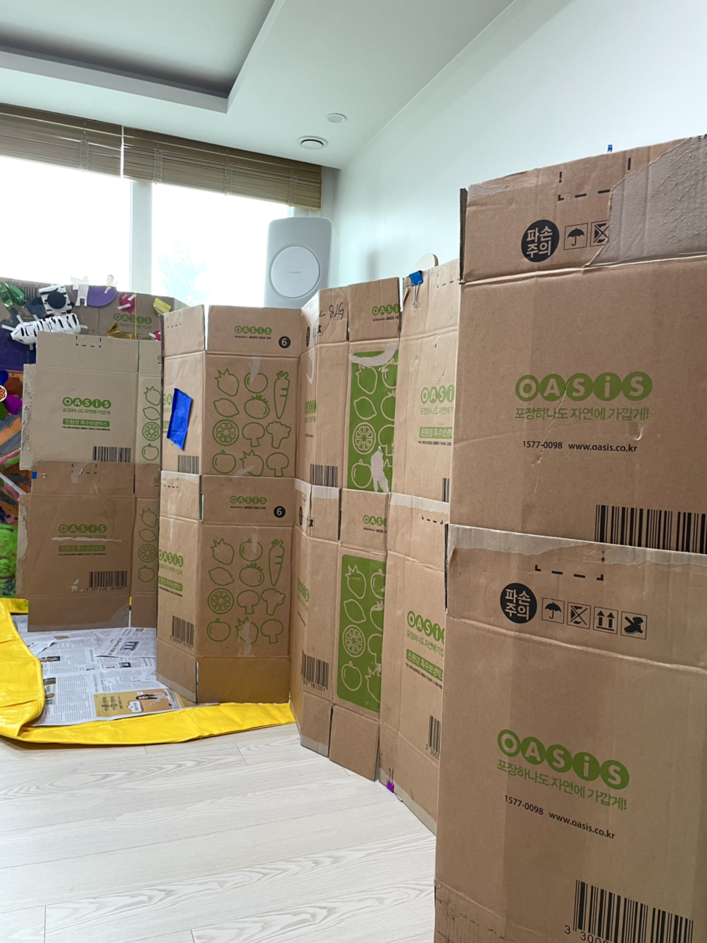 가로로 4개씩 2줄로 이어 붙인 상자를 세워봤다. 유치원에서 돌아온 아이도 옆에 세웠다. 아이 키보다 높으려면 상자 한 줄이 더 얹어져야 할 걸로 보였다. 이미 붙인 상자는 로봇의 다리 부분으로 쓰고, 위로 높일 상자는 가슴 부위가 되게 해야겠다고 방향을 잡았다. 나는 철저한 계획 하에 작업에 들어가기보다는 작업 중간에 다음 방향을 찾아가는 게 좋았다. 그런 면에서 택배 상자라는 재료가 부담 없고 편했다.