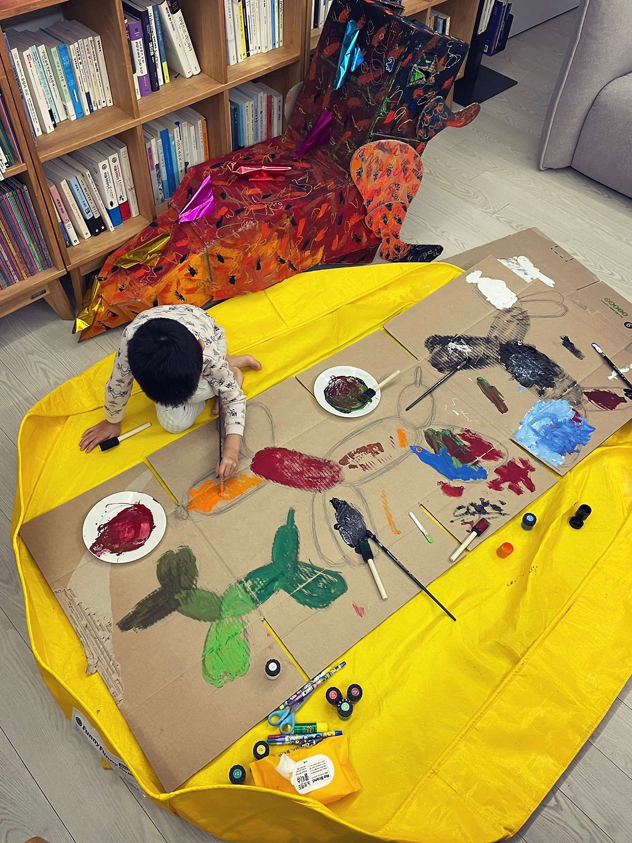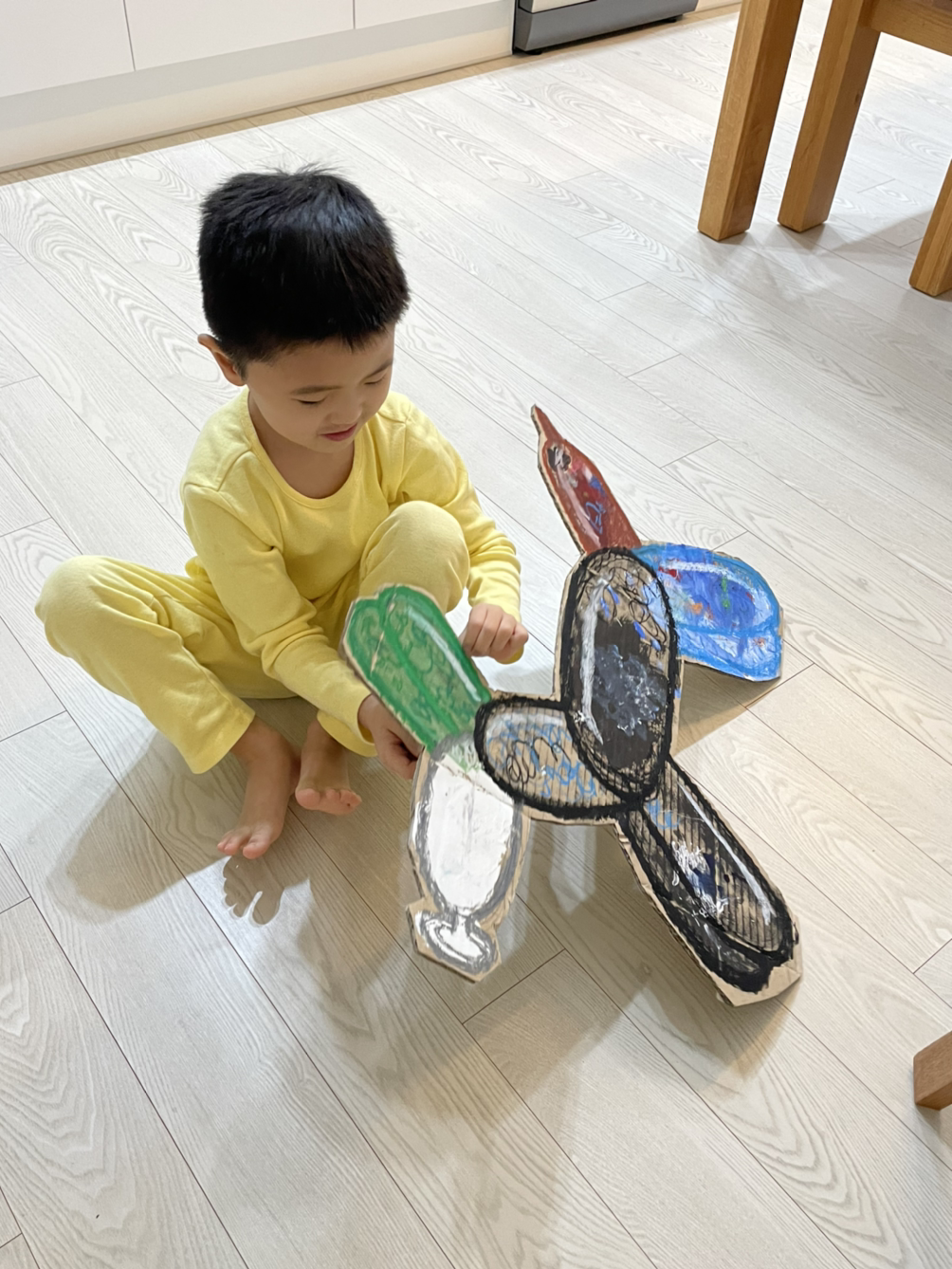 전 세계에 흩어진 벌룬독은 무수히 많은 색으로 재해석돼 있다. 우리의 택배 상자 위에서도 우리만의 색을 입힌 벌룬독을 완성해 갔다. 아이는 벌룬독을 그린다고 들떴고 이 색, 저 색을 붓에 묻혀 칠했다. 나는 벌룬독이 스틸 재질처럼 빛 반사를 일으키는 것으로 보이게 몇 개의 라인만 추가해서 넣어줬다. 아이는 살아 움직이는 강아지를 만난 것처럼 좋아했다. SNS에 올렸더니 책을 지은 튜카스 작가가 '원더풀'이라고 댓글을 달아줬다.