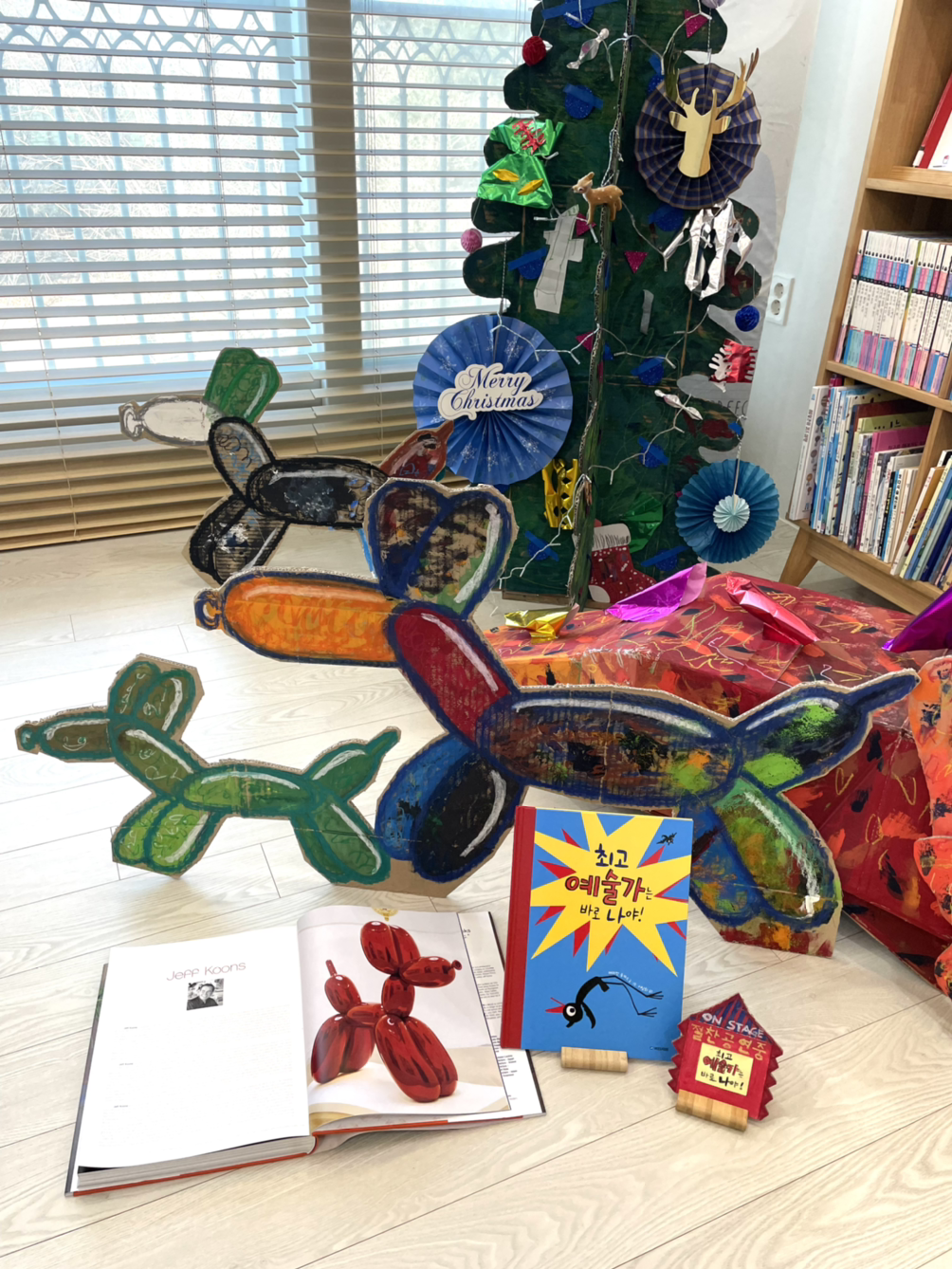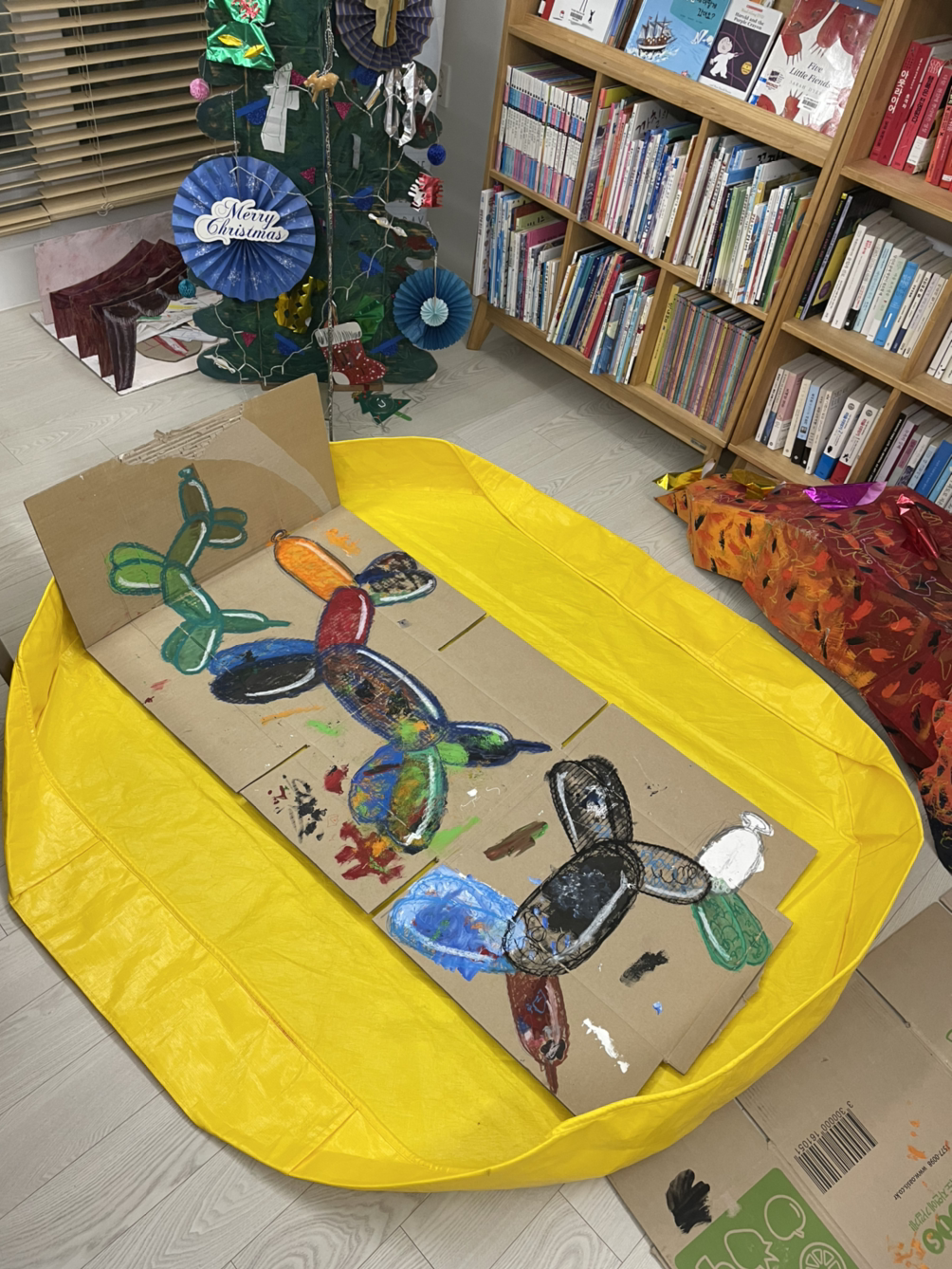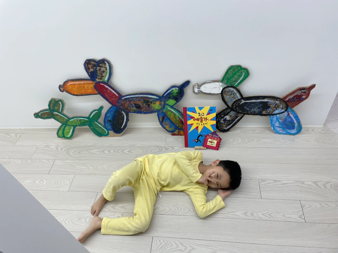 우리가 읽은 그림책 『최고 예술가는 바로 나야!(매리언 튜카스 글그림)』에는 벌룬독의 이름이 '뽕뿌아르'로 붙여져 있었다. 아이들의 눈높이에 맞춰 팝아트를 쉽고 유쾌하게 설명해놓은 작품이었다. 특히, 뽕뿌아르가 펑 터져버리는 장면이 압권이었다. 스테인리스 스틸로 된 작품이란 걸 알고 있던 내 머리를 펑 터뜨리는 것만 같았다. 아이는 어쩌면 풍선 그대로의 모습으로 작품을 받아들이고 있었을지도 모르겠다. 하지만 공들여 만든 작품이 터져버렸다는 점에서 나처럼 놀랐다. 우리 중 어느 누구도 뽕뿌아르가 터지리라곤 예상하지 못했다. 우리는 이 책을 읽고 또 읽고 나서, 한 마리, 두 마리, 세 마리의 벌룬독을 그렸다. 이번에도 역시 길게 펼친 택배 상자 위에 말이다.