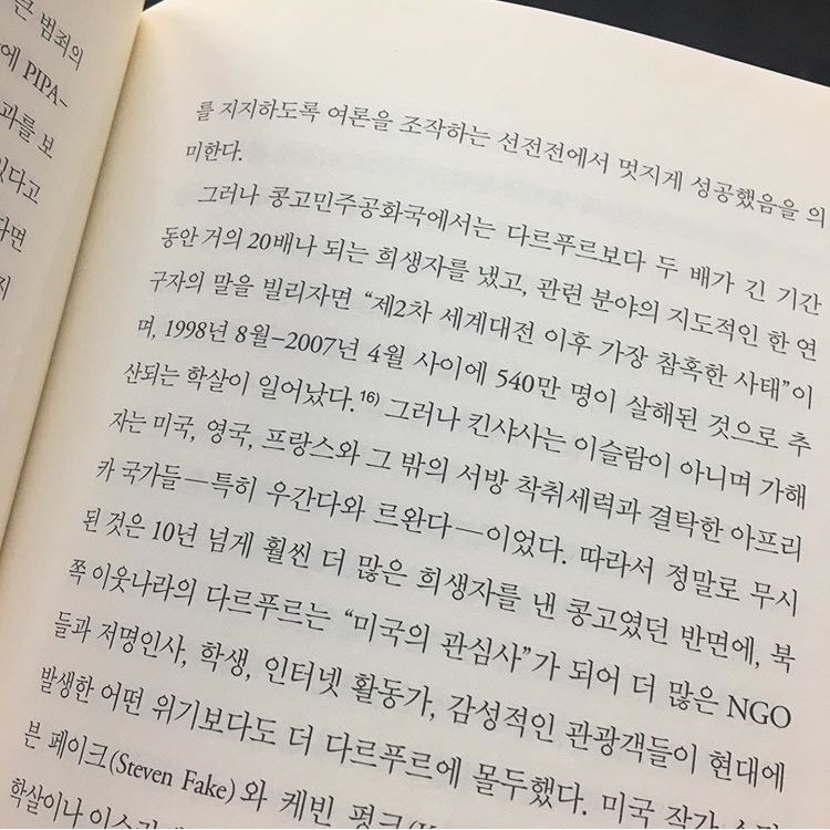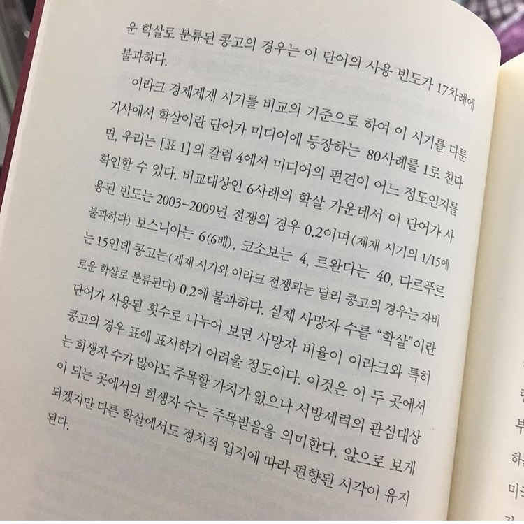 그리고 나는 그 책을 네 시간 만에 다 읽어버렸다. 임팩트가 어마어마했다. 내가 읽었던 다른 모든 책들에 대한 관점이 뒤바뀌었고, 제노사이드를 바라보던 시야 역시 전혀 다르게 넓어졌다. <학살의 정치학>은 전쟁과 학살뿐만 아니라 전후의 모든 상황들을 강대국이(특히 이 책에서는 미국에 대해 다룬다.) 어떻게 조종하는지, 언론은 존재하는 정보들을 어떤 방식으로 은연중에 왜곡시키는지 아주 논리적이고 날카롭게 비판하는 책이었다.