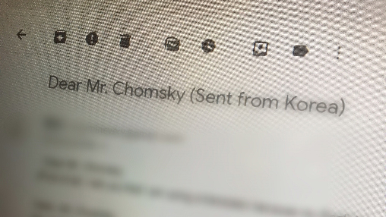 나는 그 즉시 MIT 사이트로 들어갔다. 고등학교에서 소논문 프로젝트 수업을 할 때 모 대학의 교수님을 인터뷰했었는데, 그 당시에도 학교 사이트에서 이메일 주소를 찾아 연락을 드렸기 때문이었다. 내 예상대로 촘스키가 교수로 재직 중인 MIT 사이트에는 그의 이메일 주소를 비롯한 공식적인 연락처들이 나와 있었다. 바로 이메일 주소를 복사해 붙여 넣기 한 후, 번역기 어플 두 개를 상단에 띄웠다.