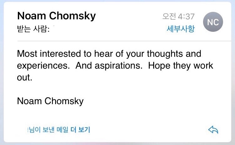 그러다 문득 나 혼자 이렇게 존경하기에는 너무 아쉽다는(…) 생각이 들었다. 이 대학자에게 나의 거대한 팬심을 전하고 싶었다.(지금 생각해보면 정신이 나간 것 같다.) SNS도 열심히 찾아봤지만 촘스키가 직접 운영하는 계정은 없었다. 그렇게 새벽 내내 머리를 열심히 굴리던 중 문득 생각난 게 있었으니…! 바로 이메일이었다.