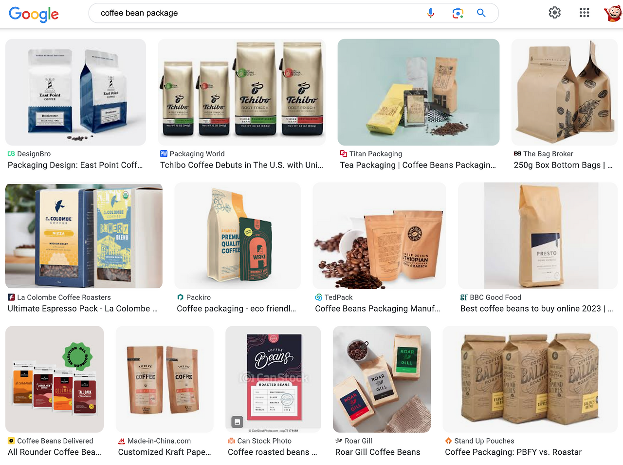 구글에서 'coffee bean package'를 검색했을 때 나오는 화면. 대부분이 크라프트, 갈색 패키지다.