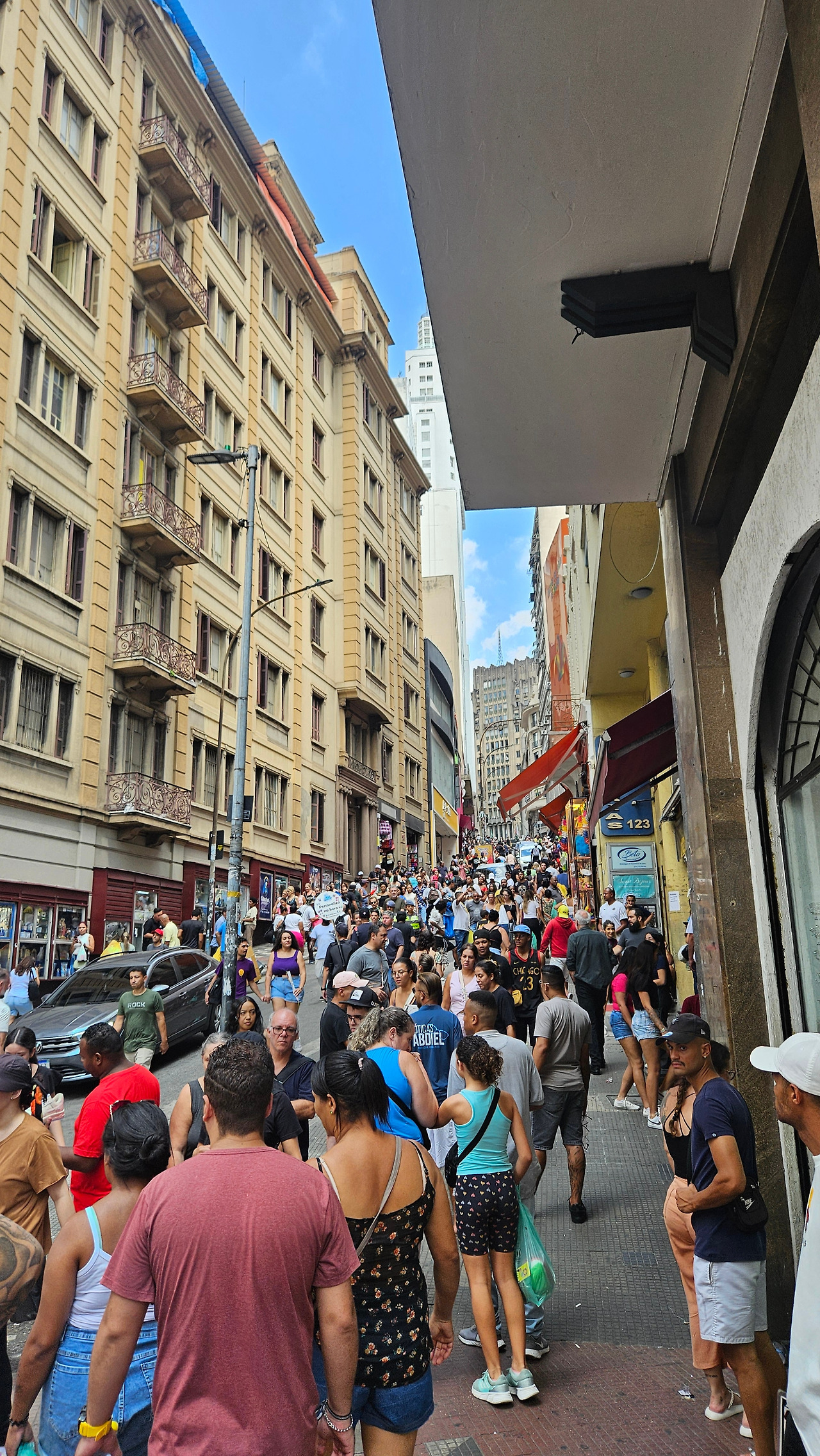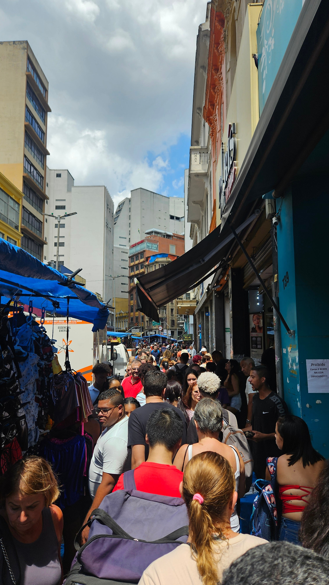 이 거대한 도시에서의 첫 행선지는 마르코 거리다. 이게 정식 명칭인지도 모르겠다. 구글맵에서는 'R. Vinte e Cinco de Março - Se'로 나오는데 실제로 뭐라고 부르는지는 모르기 때문에 그냥 정했다. 한국으로 치면 명동 거리 정도 느낌이래서. 상파울루는 어딜 가야 하나 생각보다 조금 고민이 되었다. 축구라도 했으면 경기나 봤을 텐데 하필 시즌도 아니었고, 별 특색 없는 이 큰 도시에 마땅히 갈 곳도 없다. 그 와중에 앞에 계속 얘기하고 있는 치안 문제도 겹쳐 그나마 가볼 만해 보이는 곳들도 제거된다. 그래서 크게 마르코 거리와 우리나라의 테헤란로 + 종로 느낌의 파울리스타 거리만 가기로 결정하게 됐다. 도착한 마르코 거리에 대한 아주 솔직한 내 심정은... 음, 인도 같다. 아무리 보아도 인도 같다. 조금 다르다면 어두침침한 인도 건물들과 다른 더 밝은 느낌이랄까. 아마 강렬한 한여름의 햇빛도 한몫 했을 것이다. 인도와 비슷하다고 느낀 포인트는 사람이었다. 일단 이곳에는 어마어마한 사람들이 있다. 마치 전성기에 중국인으로 가득찬 명동거리 같은. 도로 양 옆엔 월세를 지불하는 가게들과 통로에 점거된 노점상으로 꽉 차있고, 차로는 왕복 4차선 규모지만 노점상과 불법 주차로 북적한 덕에 차량이 지나다니기 힘든 구조다. 더군다나 이 수많은 인파들이 간헐적으로 차도로 튀어나오고 하니 말이다. 정말로 이곳은 정신이 없다. 한 손에는 폰을 꼭 쥐고 이런 곳에 꼭 있을 소매치기를 본능적으로 조심해야 한다.