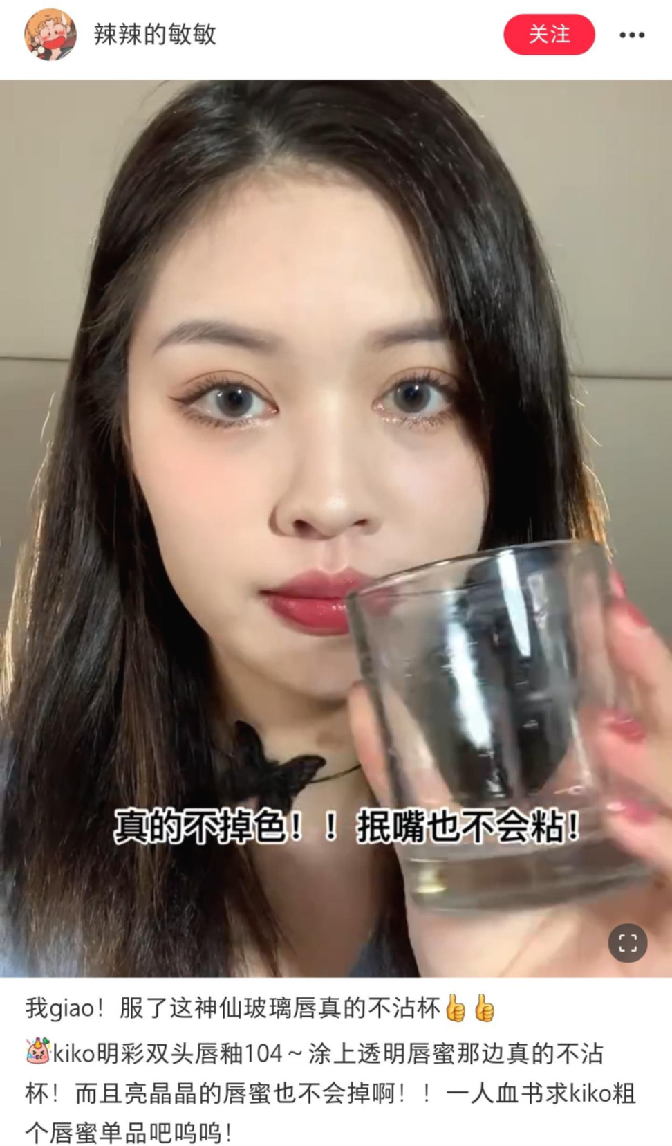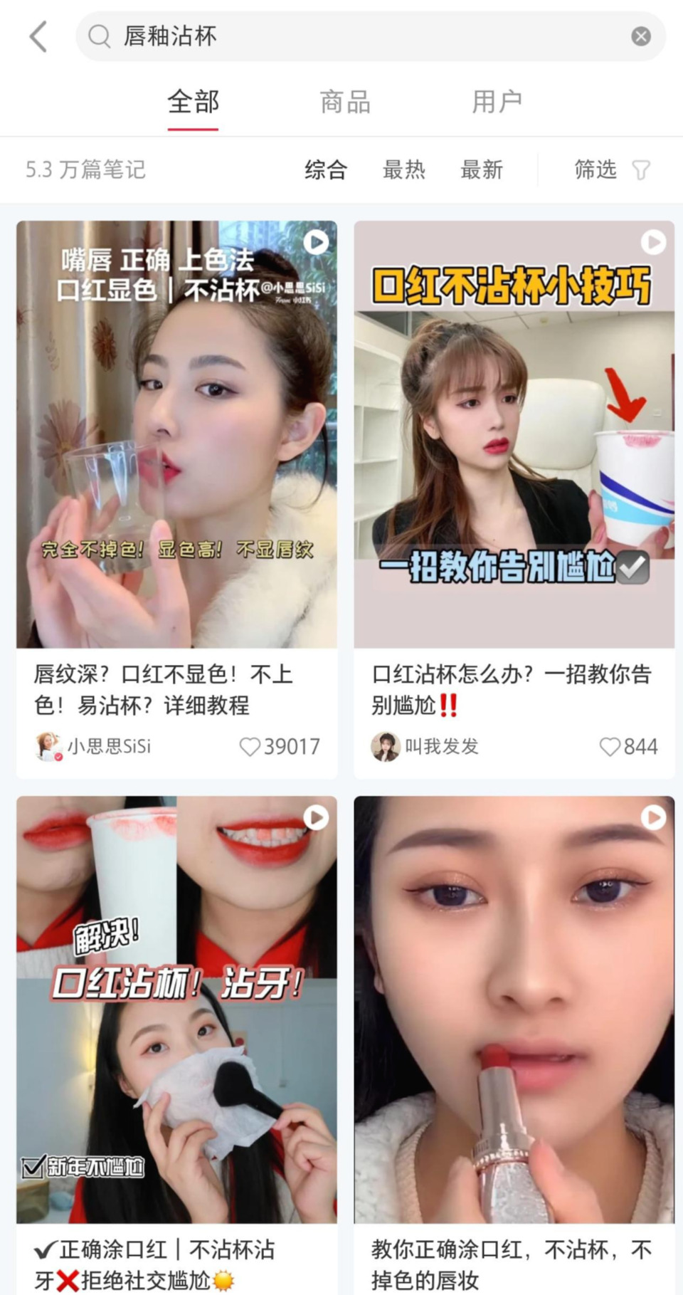 그런 니즈가 반영되어 샤오홍수에서는 唇釉不战杯라는 키워드가 핫하다. 唇釉는 틴트, 不沾은 더하지 않다, 杯는 컵이라는 의미로, 번역을 해보자면 '컵에 안 묻는 립 틴트'라는 뜻이다. 마스크를 쓰고 립을 바르면, 고정력이 없는 제품의 경우 마스크에 묻기 마련이다. 끈적거리는 텍스처의 제품이라면 질척거리며 묻게 되니 그야말로 최악이라고 할 수 있다. 이런 소비자의 고민을 기반으로, 제품 리뷰를 하는 왕홍들 사이에서 컵에 입술을 찍어 보여주는 리뷰가 성행하고 있고, 내용물이 묻어나지 않는 틴트는 입소문에 힘입어 흥하고 있다. 중국 시장에서 립 틴트 유형으로 빛을 보려면, 무조건 틴팅 효과를 신경 써야 할 것!