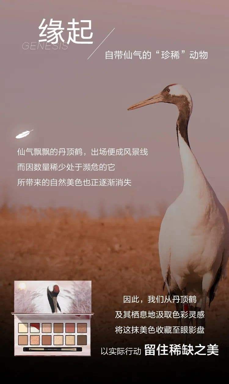 중국 아이섀도 팔레트의 메인 브랜드인 퍼펙트 다이어리는 또 다른 동물판 아이섀도 팔레트를 출시했다. 세계적으로 멸종 위기 동물인 두루미를 모티브로 고대의 메이크업을 재현해낸 <丹顶鹤(두루미)> 팔레트가 그것이다. 두루미 머리 부분의 흰색 깃털과 붉은 깃털의 조화를 메이크업 룩으로 풀어낸 것이 중국스러우면서 독특하기도 하고 아름답기도 하다.