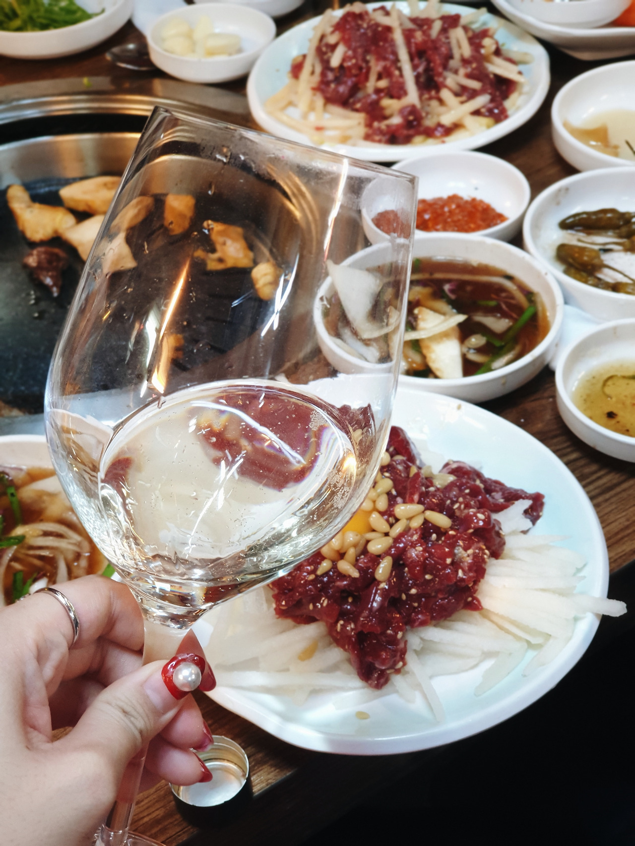 은은하게 나는 토스트 향, 그리고 한국 배가 아닌 서양 배의 향이 난다. 동그란 한국 배가 좀 더 물이 많은 삼삼한 맛이라면, 조롱박같이 생긴 서양 배는 더 달큼한 맛이 난다. 그래서 뭔가 꿀에 배를 절인 향이 가득했는데, 배랑 같이 먹는 달달한 육회랑 너무나 잘 어울렸다.