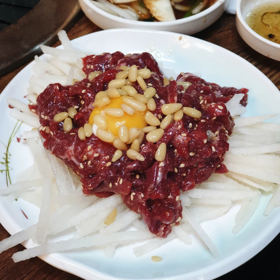 우리는 이 식당의 시그니처 메뉴인 토시살과 육회를 시켰다.