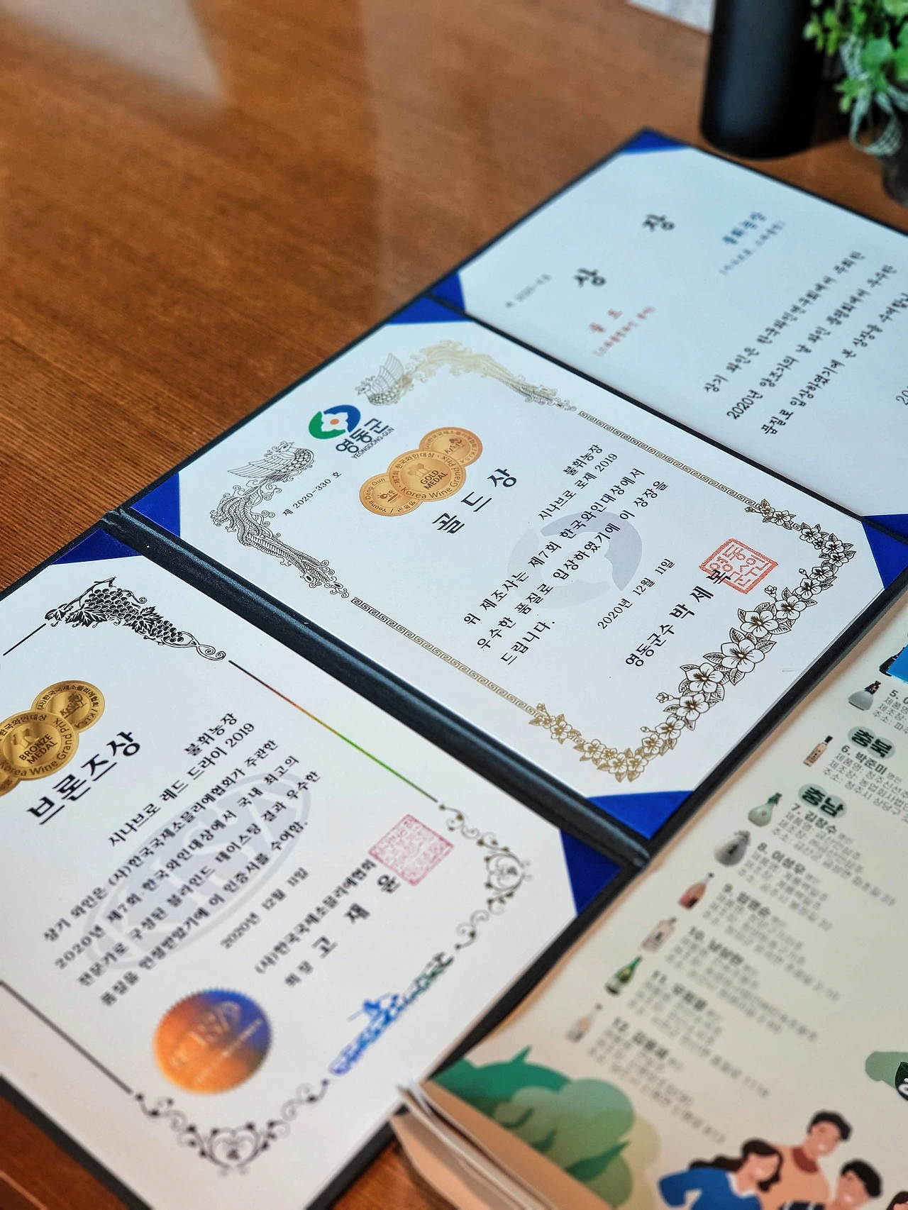시나브로 와이너리는 특히 청수를 기반으로 한 화이트 와인을 주력으로 하고 있는데, 2015년과 2016년 연속으로 아시안 와인 트로피 골드 메달을 수상한 바 있다고 한다. 또한 캠벨 얼리 품종의 단점을 보완하기 위해 이탈리아 베네토 주에서 활용하는 아파시멘토 방식을 적용한 레드 와인으로 한국 와인 베스트 셀렉션에서 그랑 골드를 수상하기도 했다고 한다. 와이너리에 들어가면, 각종 수상 내역을 직접 확인해 볼 수 있다.