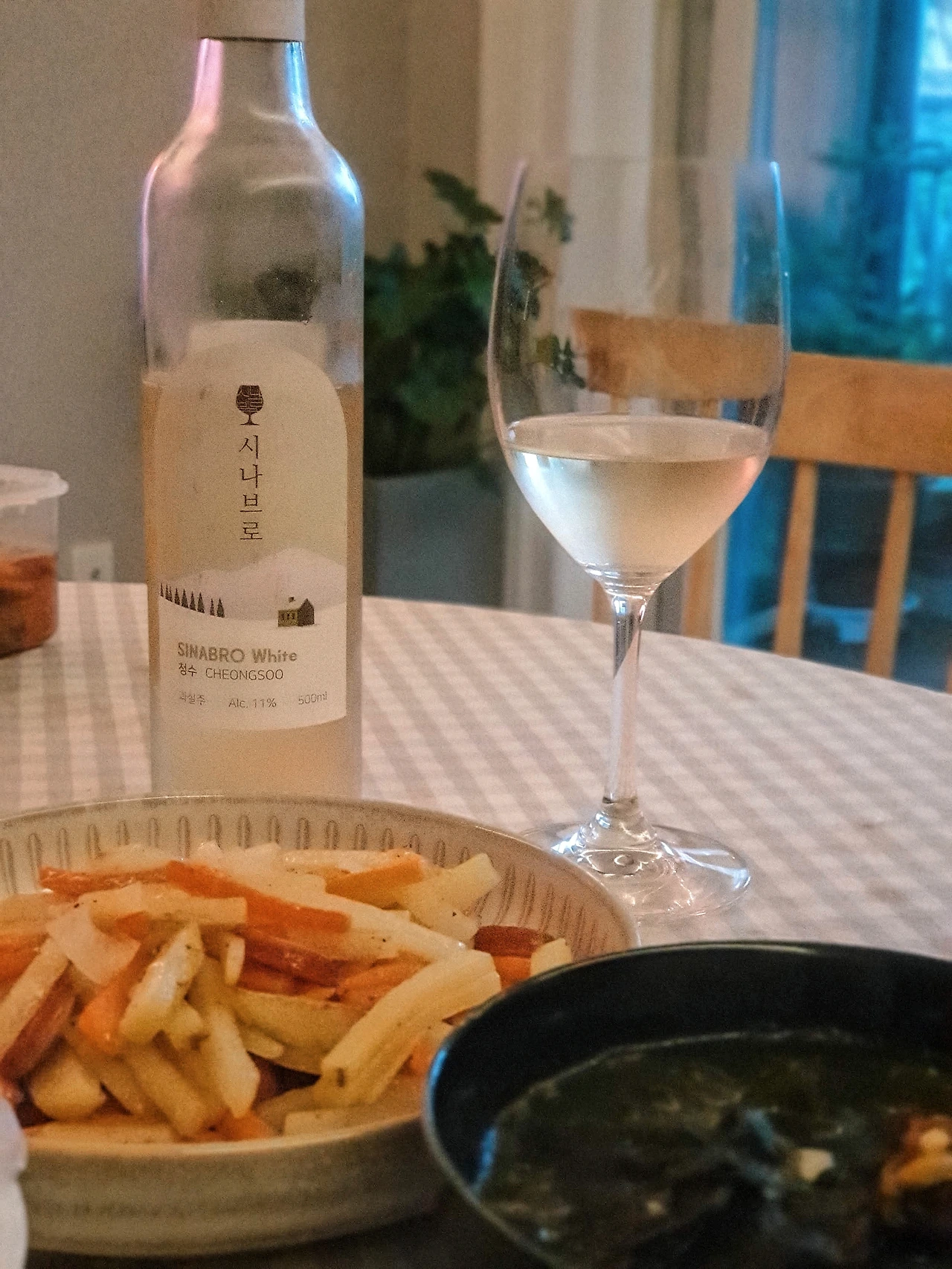 오픈을 하고 나면 청수의 화사한 향이 놀랍다. 흰 꽃과 열대 과일향이 어우러져서 특히나 여름철에 차갑게 해서 기분 좋게 마시기 좋을 것 같다. 다른 음식과 페어링해 볼 수도 있었지만, 떼루아를 살려 한식과 페어링을 해 보았다. 깔끔한 맛이 한식과 어우러졌다.