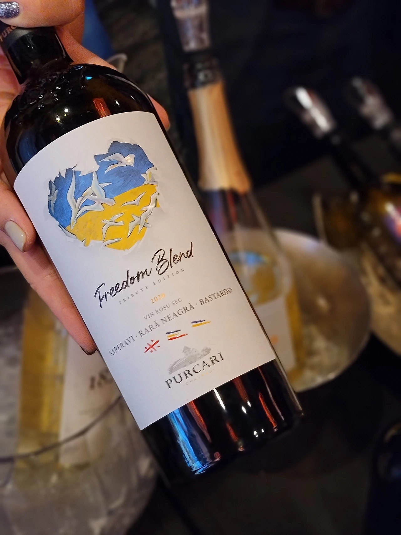 레이블부터 눈에 확 들어오는 샤또 푸카리 프리덤 블렌드 2020 빈티지. 이 와인은 구 소비에트 연방에서 독립한 조지아, 몰도바, 우크라이나를 기념하기 위해 만들어진 와인이다. 그렇기 때문에 조지아의 사페라비 품종이 65%, 몰도바의 라라네그라 품종 20%, 우크라이나의 바스타르도 15%가 블렌딩 된 아주 멋진 와인이다. 러시아의 우크라이나 침략으로 인해 레이블도 이렇게 우크라이나의 국기와 평화의 상징 흰 비둘기로 디자인되어 있다. 심지어 구매를 하면 우크라이나에 기부도 된다고.