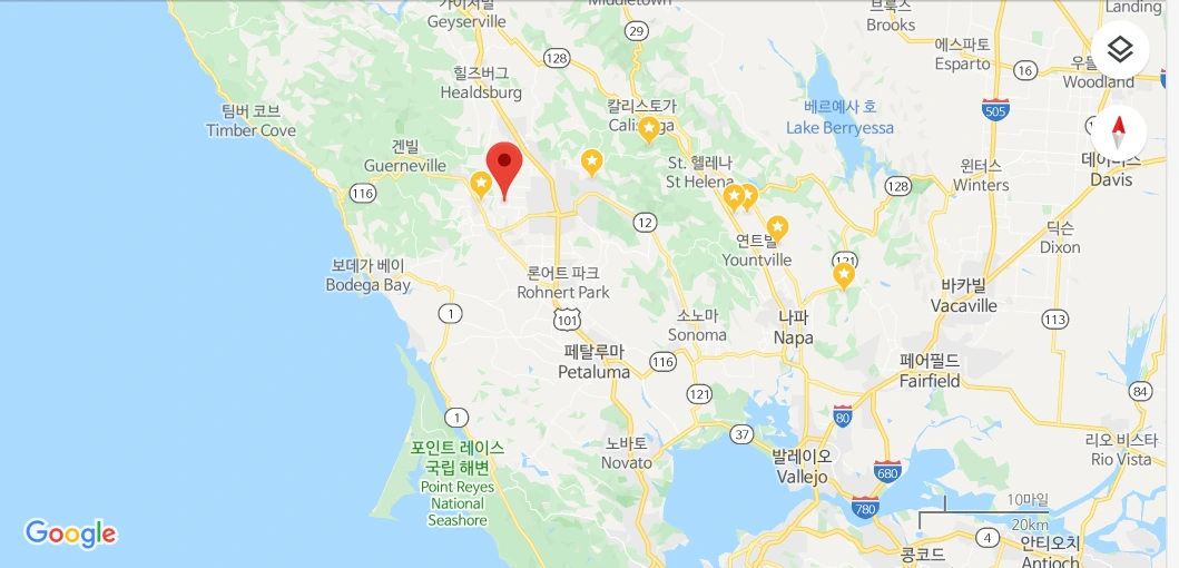 미국 캘리포니아의 주요 와인 산지로는 '나파 밸리'와 '소노마 카운티'가 있다. 월터 헨젤 와이너리는 그중 우리에게 더 익숙한 '나파 밸리'보다 서쪽인 '소노마 카운티'에 위치해 있다. 보는 것과 같이 태평양과 인접해 있어 기후에도 많은 영향을 받는다.