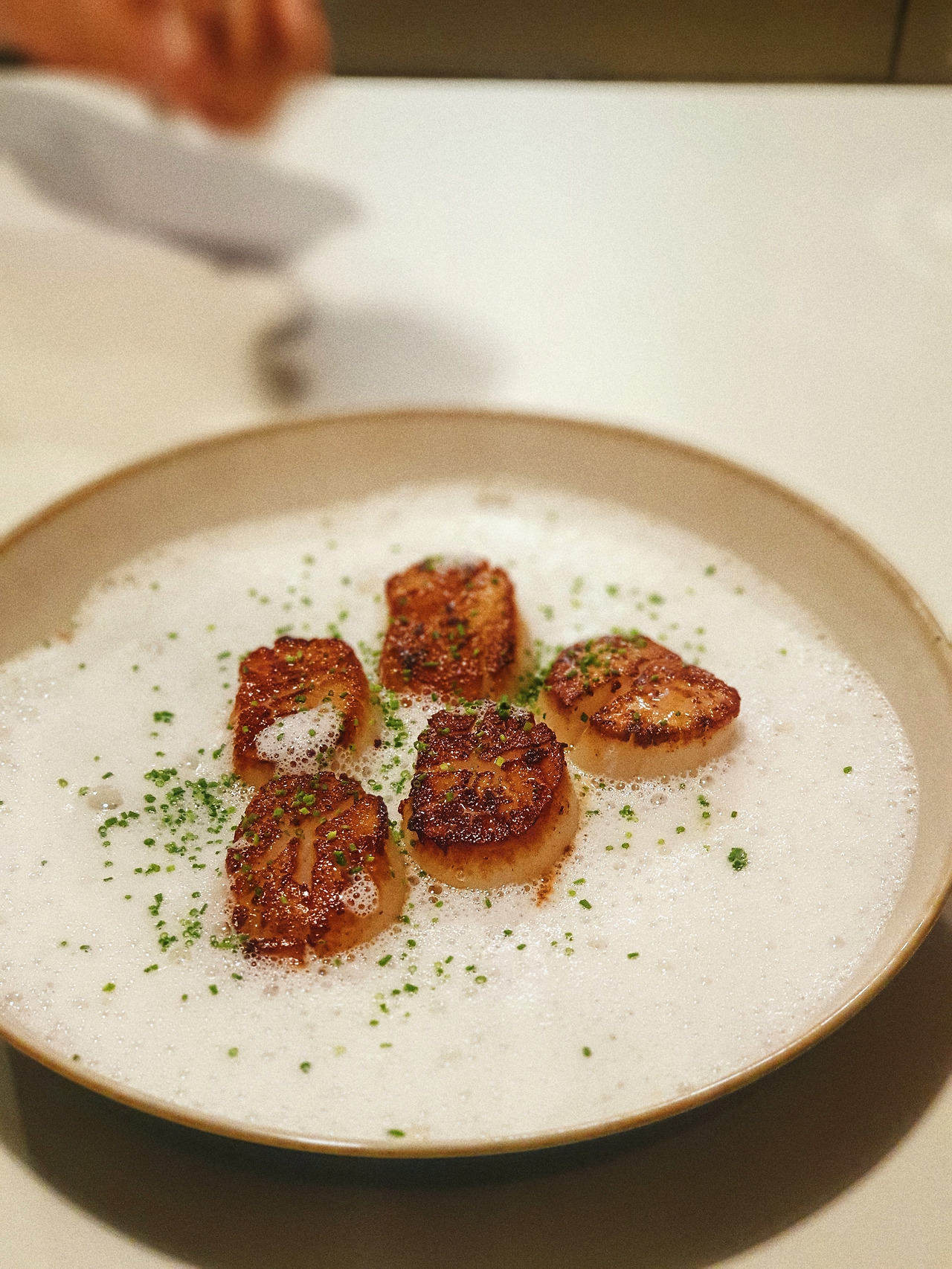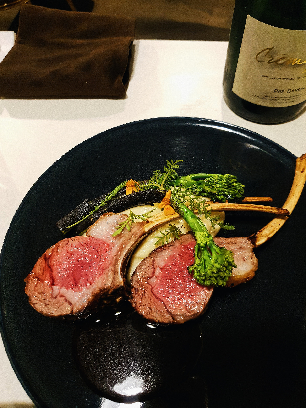 이 크레망은 샤르도네 60%에 아르부아라는 다소 생소한 포도가 40% 블렌딩 되어있다. 손으로 포도를 직접 수확한 뒤 48시간 동안 정제하고, 스테인리스 탱크에서 15일간 1차 발효를 한 뒤, 18~36개월 간 2차 발효를 진행한다고 한다. 약간 짙은 밀짚 컬러로 사과 향과 이스트 향이 풍부하다. 산미는 크게 높지 않고, 피니쉬에 혀가 쪼이는 듯한 습습하고 무거운 미네랄리티의 기운이 있는데, 이게 아르부아라는 포도 품종의 특징일까 싶다. 그 씁쓸한 피니쉬 때문인지 무거운 양고기랑도 매칭이 가능했다. 그러나 베스트는 관자 요리 스캘럽 로얄과의 페어링.