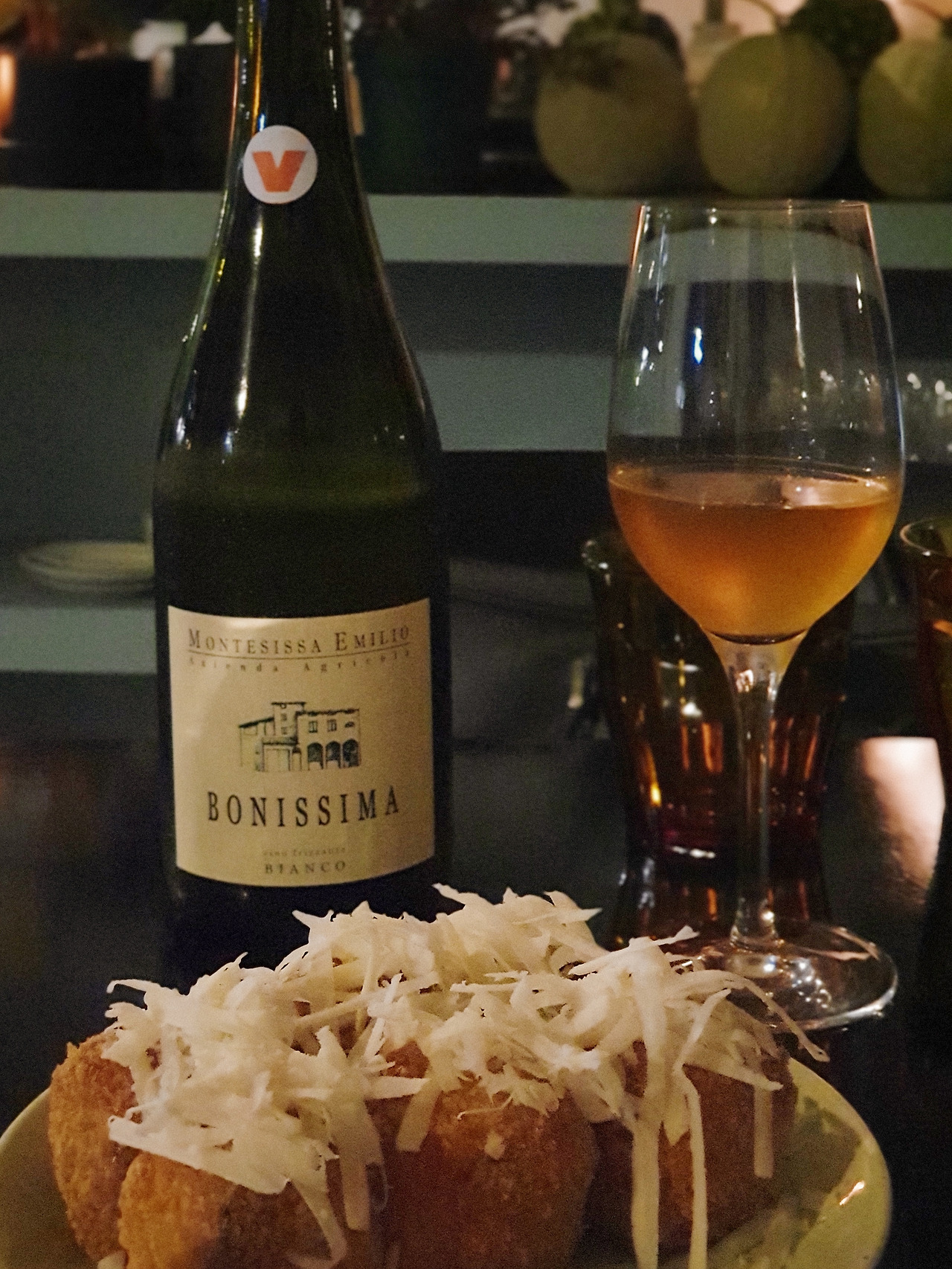 몬테시싸 에밀로 보니씨마 프리잔테 비앙코는 껍질을 함께 침용하여 만든 오렌지 와인이다. 백포도를 사용하지만, 껍질을 함께 발효하기 때문에 특유의 오렌지 빛이 난다. 몬테시싸 에밀로는 에밀리아 로마냐 지역의 와인 메이커로, 에밀리아 로마냐 주에는 이탈리아 미식의 고장 볼로냐가 위치해 있다. 이 와인은 껍질과 함께 15일간 발효한 뒤, 병에서 필터링 없이 자연적으로 12개월 동안 2차 발효를 한다고 한다. 포도 품종은 말바시아 디 칸디아, 오르투르고가 블렌딩 되었는데, 두 품종 모두 이탈리안 토착 품종이다. 보통 두 가지 품종이 함께 블렌딩 된다고 한다.