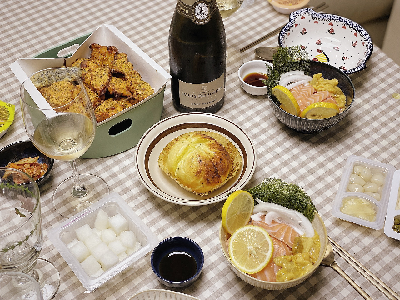 힘들 때는 남의 손을 빌리는 것이 좋다. 준비하는 사람이 즐거워야 하는데, 준비하는 사람이 스트레스라면 온 손님도 괜히 머쓱해지기 마련이다. 그래도 대접하는 건데, 배달음식이 탐탁지 않다면 마켓 컬리의 도움을 받자. 마켓 컬리를 보면 돈가스나 튀김 종류 같은 것을 많이 파는데, 그것을 밥 위에 올리면 가츠동으로 둔갑한다. 양파와 계란을 간장과 물, 설탕을 넣은 양념에 살살 조려 밥 위에 얹고, 그 위에 튀김을 얹으면 우리가 흔히 먹는 가츠동 완성이다. 비슷하게 할 수 있는 것에는 연어우니동이 있다. 마켓 컬리에서 연어와 우니를 주문해서, 정말 밥 위에 얹은 다음에 물에 담가 매운 기운을 뺀 생양파를 올려주면 끝이다. 참 쉽죠?