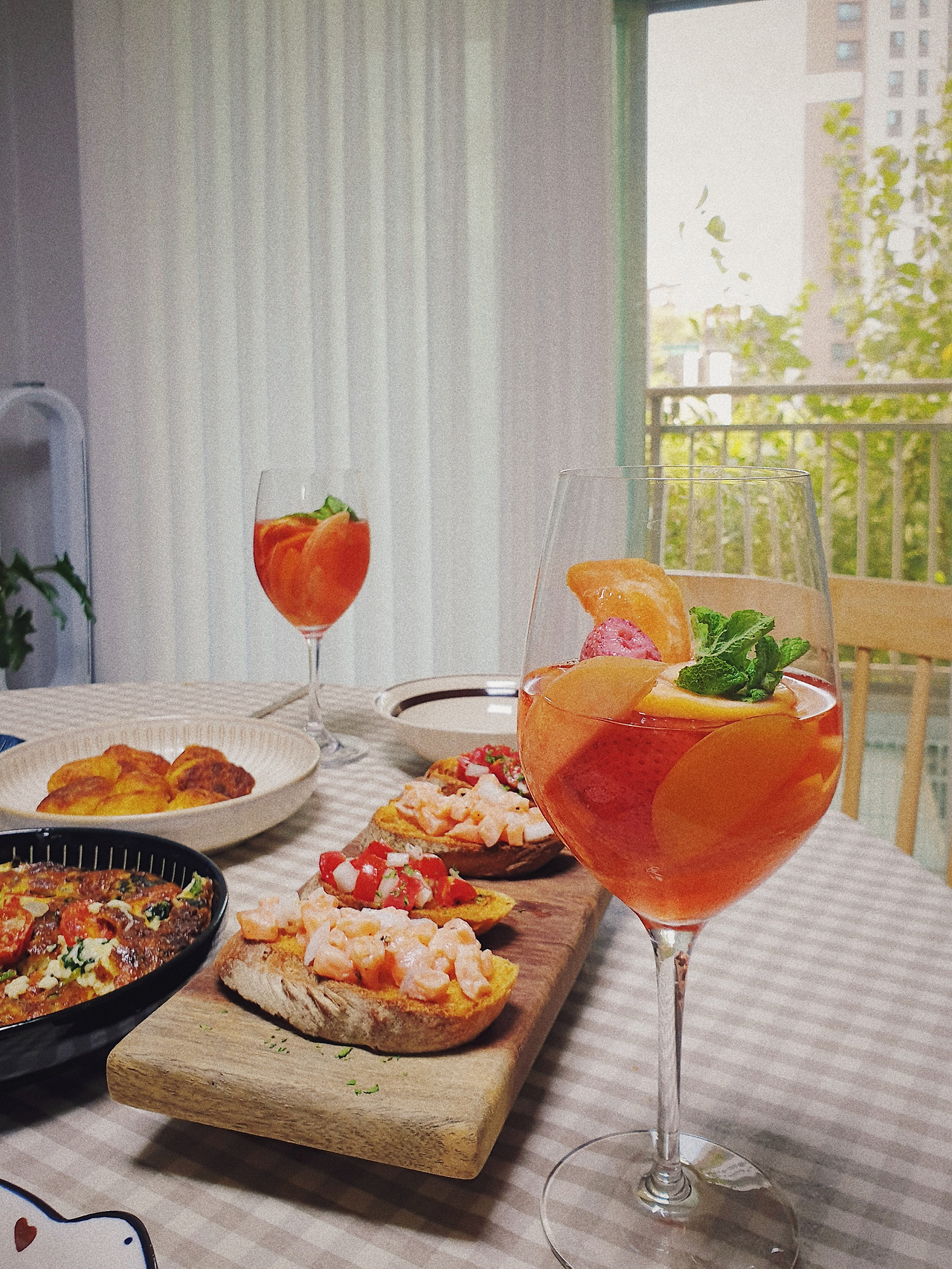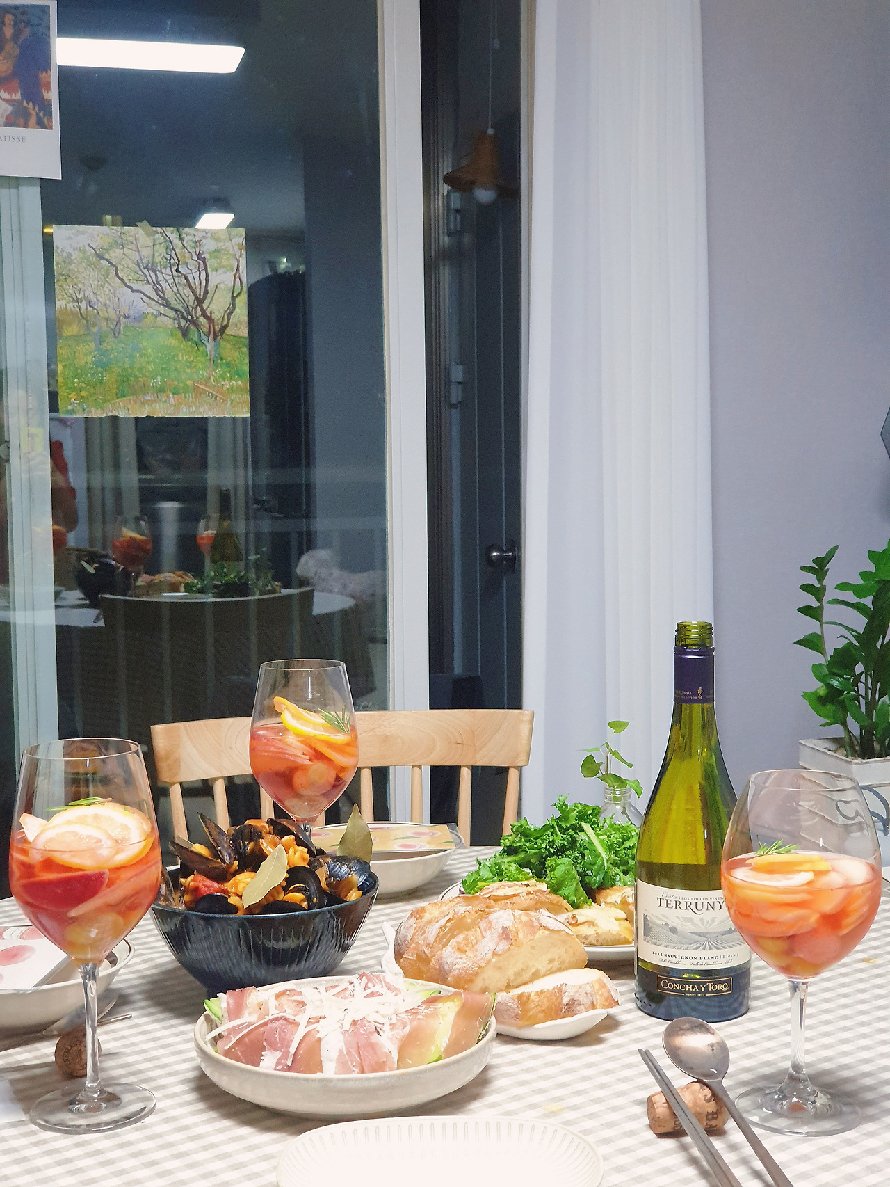 집들이를 특별한 분위기로 만들고 싶다면, 샹그리아를 추천한다. 일단 비주얼적으로 점수를 먹고 들어가는 것뿐만 아니라, 물리적으로도 그다지 힘들지 않아 적은 공수로 분위기 내기 매우 좋다. 샹그리아는 집들이 하루 전에 담그는 것이 좋다. 미리 준비한다고 이틀 전에 담가보았는데, 특히 베리류의 과일들이 흐믈흐믈해져서 보기가 좋지 않았다. 따라서 하루 전에 담그는 것을 권장한다. 모스카토 같이 달달한 와인들을 많이들 사용하지만, 단 것을 좋아하지 않는 사람들은 이마트의 도스 코파스 화이트를 사용하면 된다. 한 병에 4,900원이라 몹시 혜자스럽다. 과일 종류는 시트러스 계열 과일 1개와 색을 낼 수 있는 베리류는 필수. 나머지는 냉장고에 방치되어 있는 과일들을 하나씩 넣어주면 된다. 처음에는 자몽을 넣었었고, 두 번째는 레몬을 넣었었는데 개인적으로는 레몬이 더욱 상큼해서 맛이 좋았다. 해본 것 중 가장 맛있었던 조합은 레몬, 사과, 청포도, 딸기 조합. 딸기에서 물이 빠져나와 만든 오렌지빛 컬러는 보기만 해도 상큼하다. 각종 과일들을 도스 코파스 화이트 와인에 담가놓고, 다음날 꺼내 손님을 대접할 때에 허브 하나씩 올리고 탄산수를 조금씩 부어주면 그만이다. 간편하고, 분위기까지 로맨틱하게 만들어주니, 그것이야 말로 일석이조.