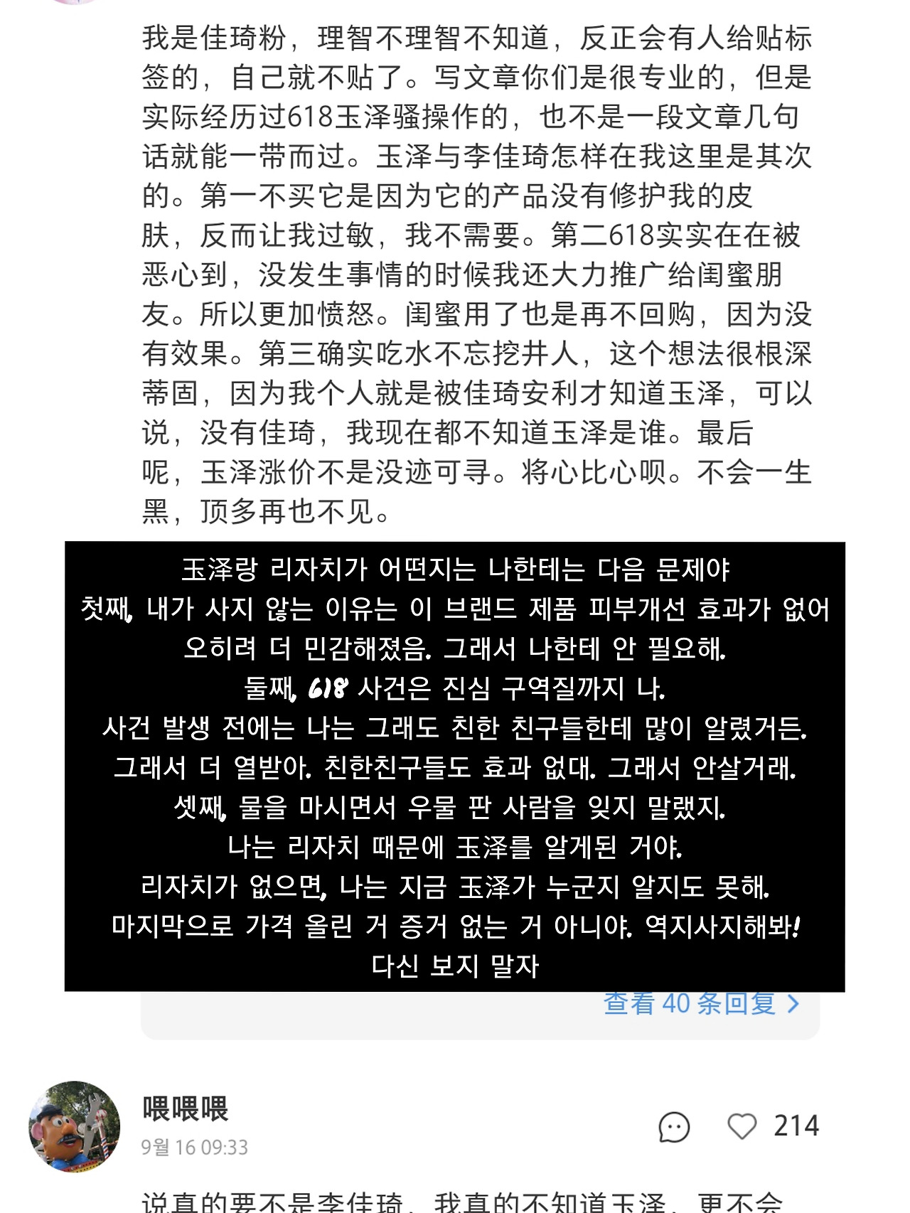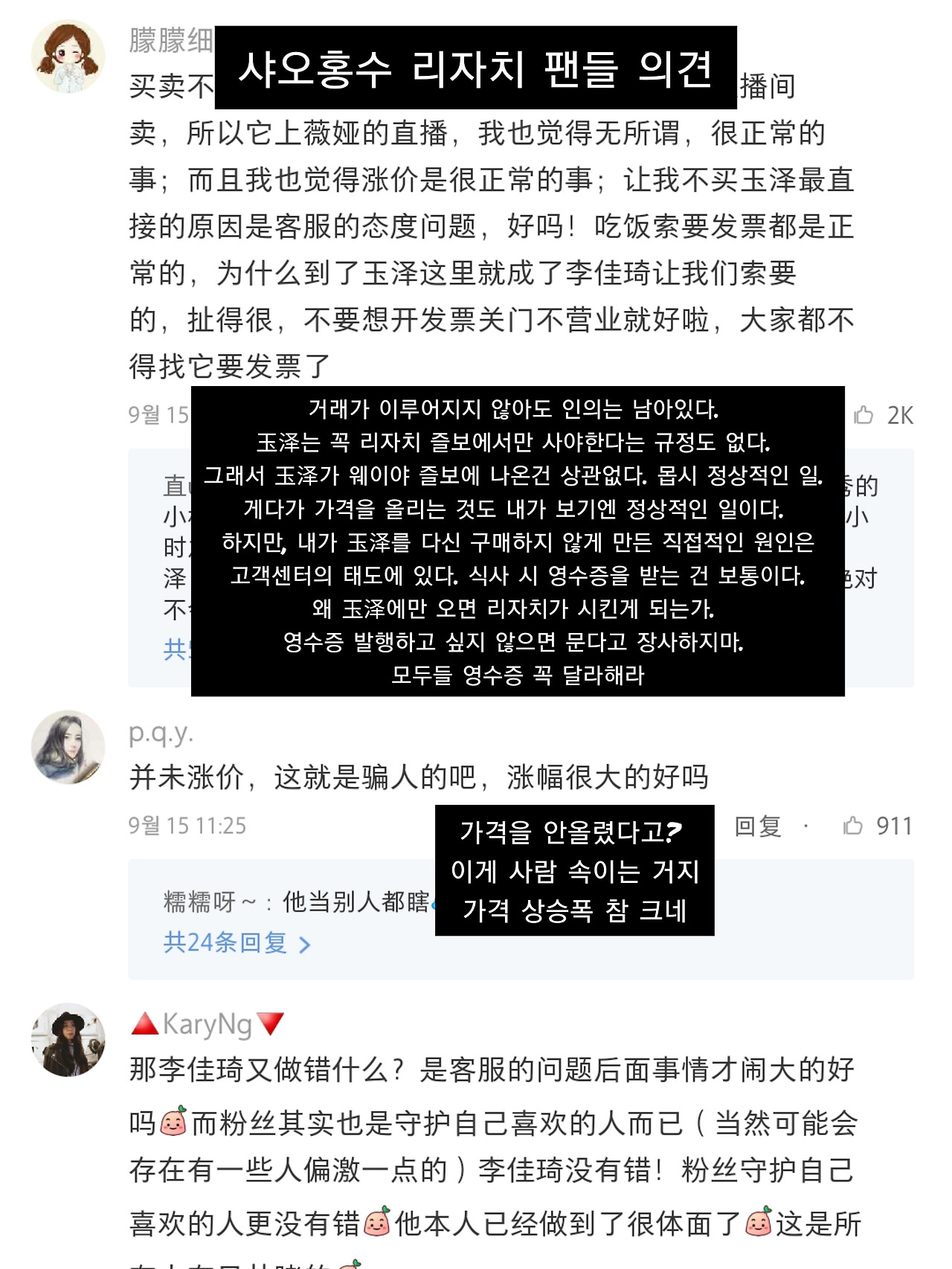 샤오홍수에 올라온 리지아치와 玉泽의 갈등 포스팅