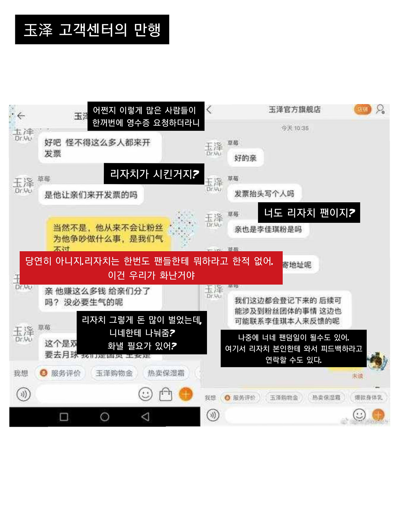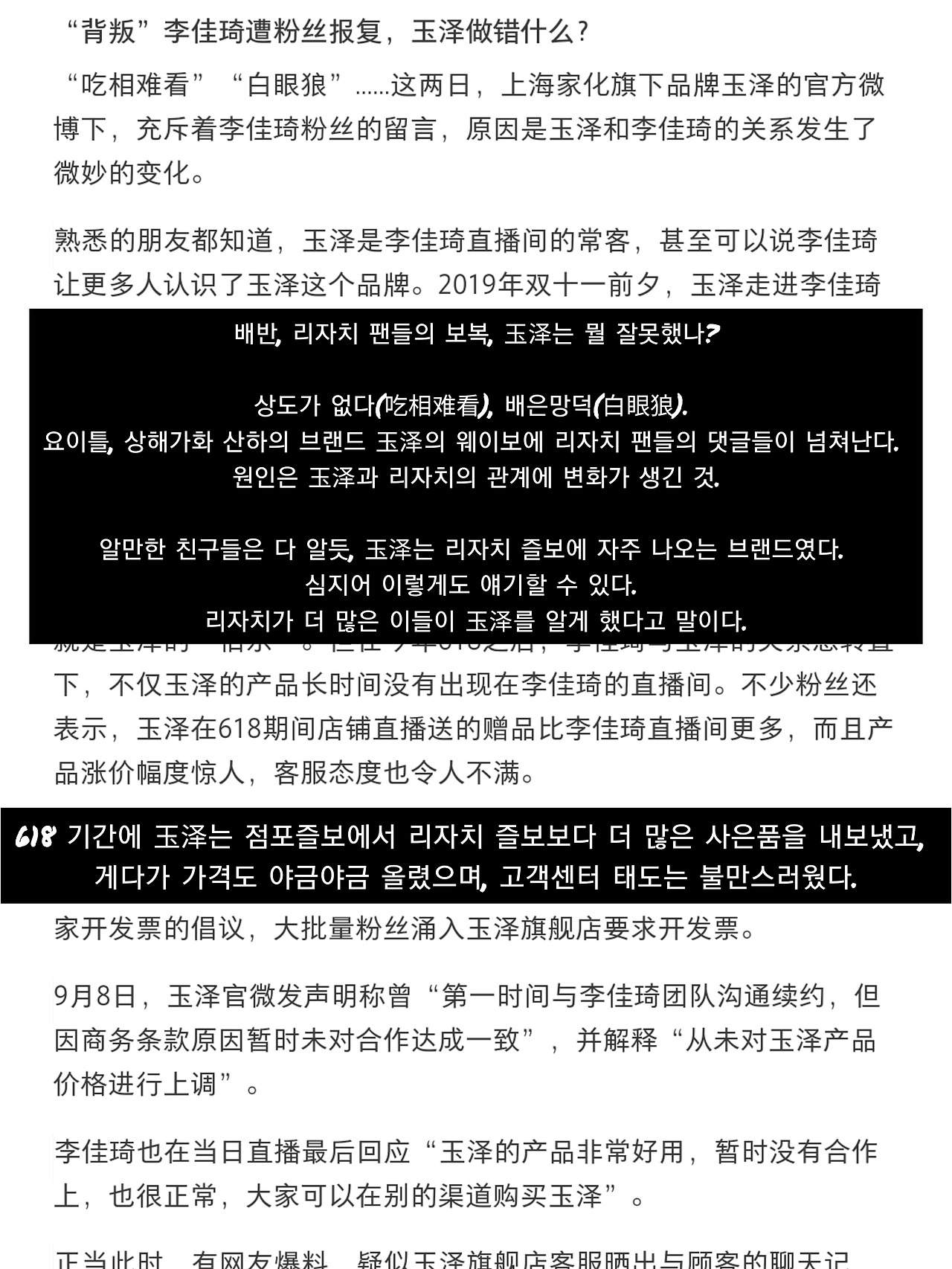 궁예를 해보자면, 玉泽는 이제 슬슬 브랜드 팬들을 玉泽 브랜드 관으로 옮기려고 했던 모양이다. 왕홍 라이브를 통해 판매하면 단기적인 매출은 발생하지만, 왕홍 수수료나 판촉비 등으로 인해 수익은 거의 0에 수렴하기에 브랜드에게는 골치였을 것이다. 하지만 문제는 玉泽팬의 대부분이 브랜드 골수팬이 아닌 리지아치의 팬, 즉 '玉泽팬 = 리지아치팬'이었던 것. 리지아치팬들은 이것은 玉泽의 배반이라 하며, 다 같이 영수증 발행을 요청했다. 우리나라에서의 영수증 발행은 늘 있는 보통의 일이지만, 중국은 기업이 국가에서 영수증을 따로 구매해서 발행을 해야 한다고 한다. 그러니 발행을 안 하면 세금을 덜 내는 셈. 그런데 팬들이 왕창 영수증 발행을 요구했으니 브랜드로서는 갑자기 내야 할 세금이 늘어난 것이다. 이건 사실 소비자의 당연한 권리니까 뭐라 할 수는 없는데, 브랜드 고객 센터에서는 오히려 "느그 리지아치가 시키드나?"를 시전 하며 요단강을 건너고야 말았다(바이, 짜이찌엔)