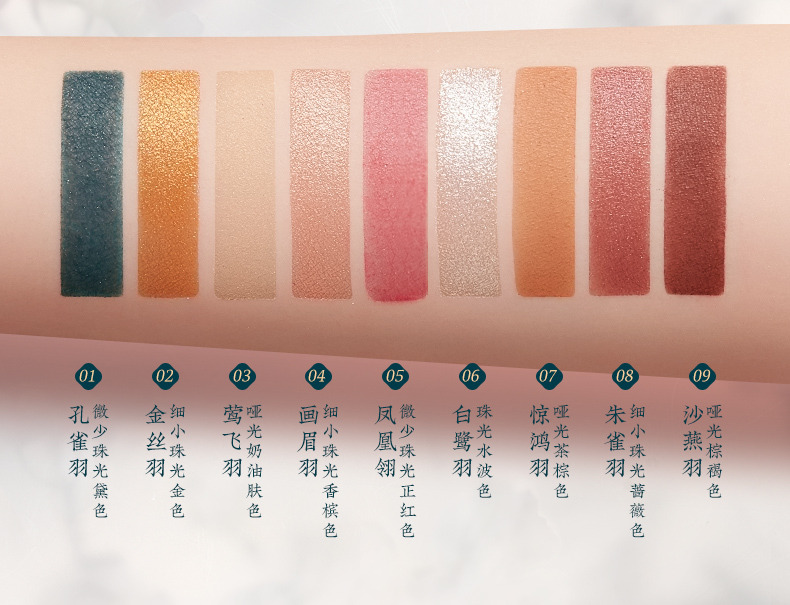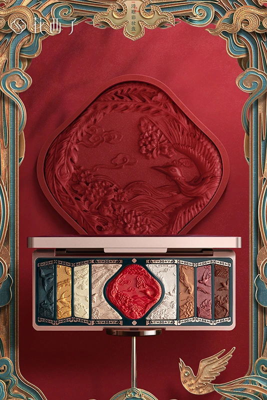 제품명과 홋수명, 그리고 제품에 새겨진 각인들이 하나의 스토리를 보여주는 것도 몹시 놀라웠는데, 예를 들어 팔레트는 봉황이 백조의 은혜를 입어 화려한 깃털을 가지게 되었다는 내용의 <백조조봉>을 세밀하게 조각하여 그려냈고, 각 홋수 이름도 공작새 깃털(孔雀羽), 금실 깃털(金丝羽), 꾀꼬리 깃털(鹰飞羽), 화미조 깃털(画眉羽), 봉황 열쇠(凤凰钥), 흰색 깃털(白酱羽), 기러기 깃털(惊鸿羽), 붉은 참새 깃털(朱雀羽), 제비 깃털(沙燕羽)로 백조조봉의 스토리를 충분히 표현하고 있다.