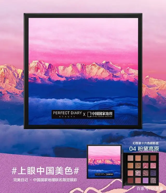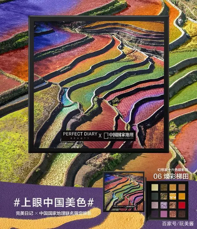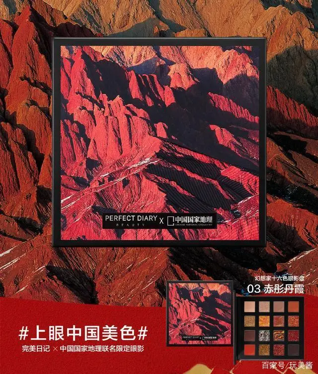 중국 지리판은 1950년부터 창간된 중국 과학 저널 中国国家地理와 콜라보레이션한 것으로, 중국의 아름다운 자연경관에 영감을 받아 제작되었다. 16색으로 구성된 아이섀도 팔레트로 총 4개 홋수가 출시되었는데 메인 비주얼부터 제품까지 아름답게 제작되었다. 붉게 물들어 산언덕을 찬란하게 내리쬐는 노을빛을 담은 赤彤丹霞(붉은 노을), 분홍색 노을이 광활한 산맥을 휩쓸고 뭇산들의 검푸른 빛깔이 서로 눈부시게 비치는 모습을 담은 粉黛高原(분홍빛 검푸른 고원), 푸른 호수를 담은 碧蓝湖泊(짙푸른 호수), 막 떠오르는 붉은 해가 계단식 밭을 겹겹이 쌓아 여러 색을 만드는 것을 표현한 焕彩梯田(환히 빛나는 계단식 밭) 이렇게 네 가지 홋수로 구성되어 있다.