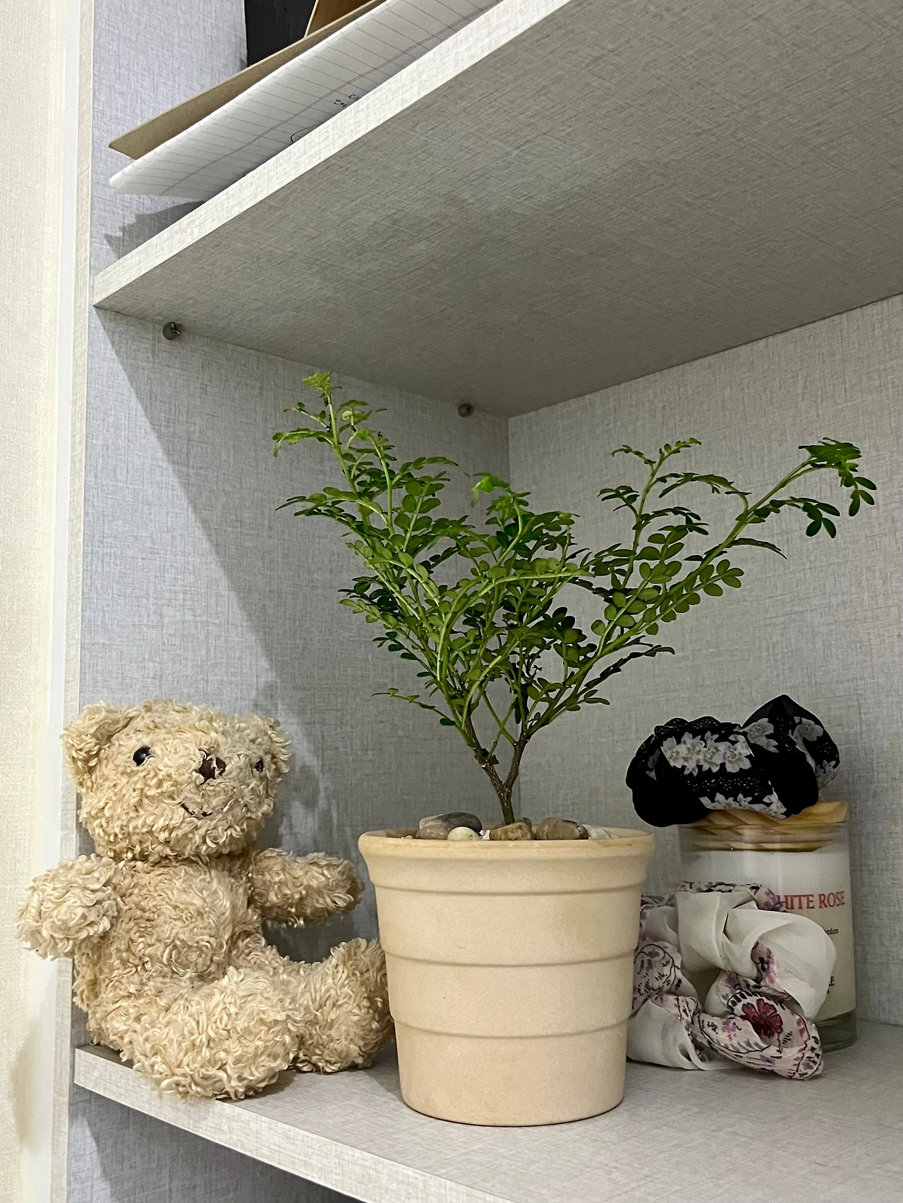 집에는 '만두'라는 호기심 많은 고양이가 기다리고 있기 때문에 고양이에게 해로운 식물을 추리느라 여러 후보의 식물을 놓쳤다. '몬스테라'와 '홍콩야자'를 뒤로하고 '문샤인'과 '산초'라는 두 선택지를 고민했다. 줄기부터 잎까지 일체형의 모습을 띠고 있는 문샤인은 줄기 부분에는 하얀 연두색빛이 돌고 잎 부분은 초록하여 내가 가장 좋아하는 채소인 파와 비슷하게 생겼다. 또한 조그맣고 조용하게 생긴 모습에 내가 키워주고 싶은 마음이 들었다. 그리고 산초는 이파리를 떼서 심어놓은 것처럼, 한 그루의 나무 같지만 앙증맞은 생김새를 갖고 있다. 잎 하나하나는 더 작은 데다 윤기가 있어 인조 식물처럼 보였다. 작지만 큰 한 줄기의 이파리와 작지만 거대한 나무 사이 열심히 고민한 결과, 산초를 집에 데려오기로 결정했다.