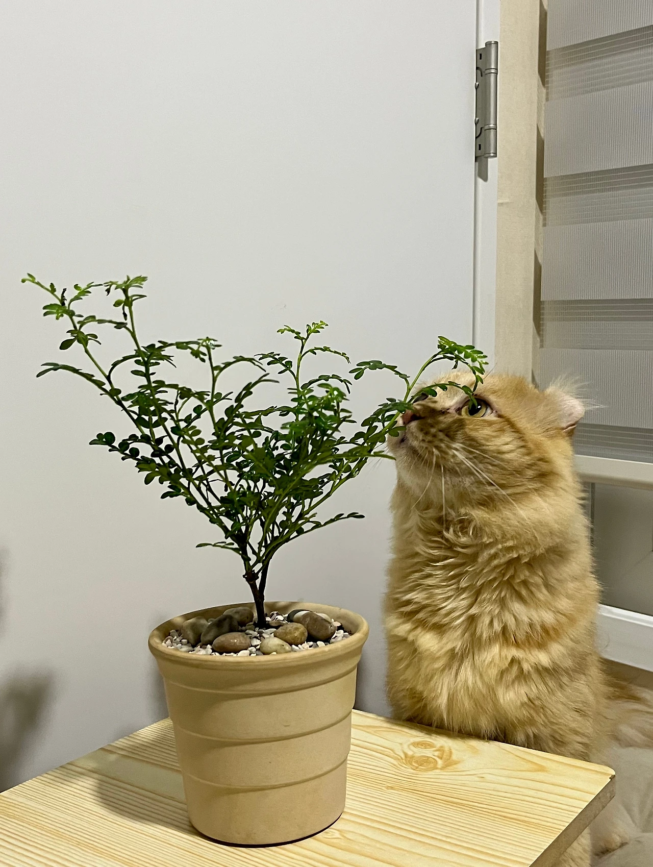 이파리가 연약해서 두 손 받쳐 드는 게 나을 거라는 꽃집 사장님의 말씀에 조심히 집까지 모셔왔다. 우선 적당한 곳에 올려두어 사진 몇 장을 찍고 잠시 한눈을 팔던 중 만두의 기다란 꼬리 끝에 산초의 작은 잎들이 떨어져 나갔다. 방금 전까지 아기 돌보듯 소중히 데려온 우리 산초가 눈앞에서 떨어져 정말 깜짝 놀라 당장 산초를 격리시켰다. 고양이에게 해롭진 않지만 식물을 해하는 고양이라니..