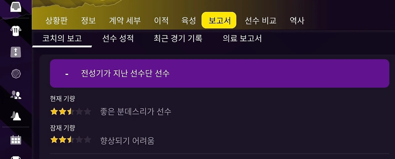 여기에는 선수의 능력치를 세분화하여 수치로 나타낸 자료들이 있는데, 종종 '전성기가 지난 선수'라고 적혀있는 보고서를 받을 때가 있다. 우승이라는 목표를 좇는 냉철한 감독이기에 이러한 선수들은 관리도 잘 신경써주지 않으며 점점 관심 밖의 인물이 되어간다.