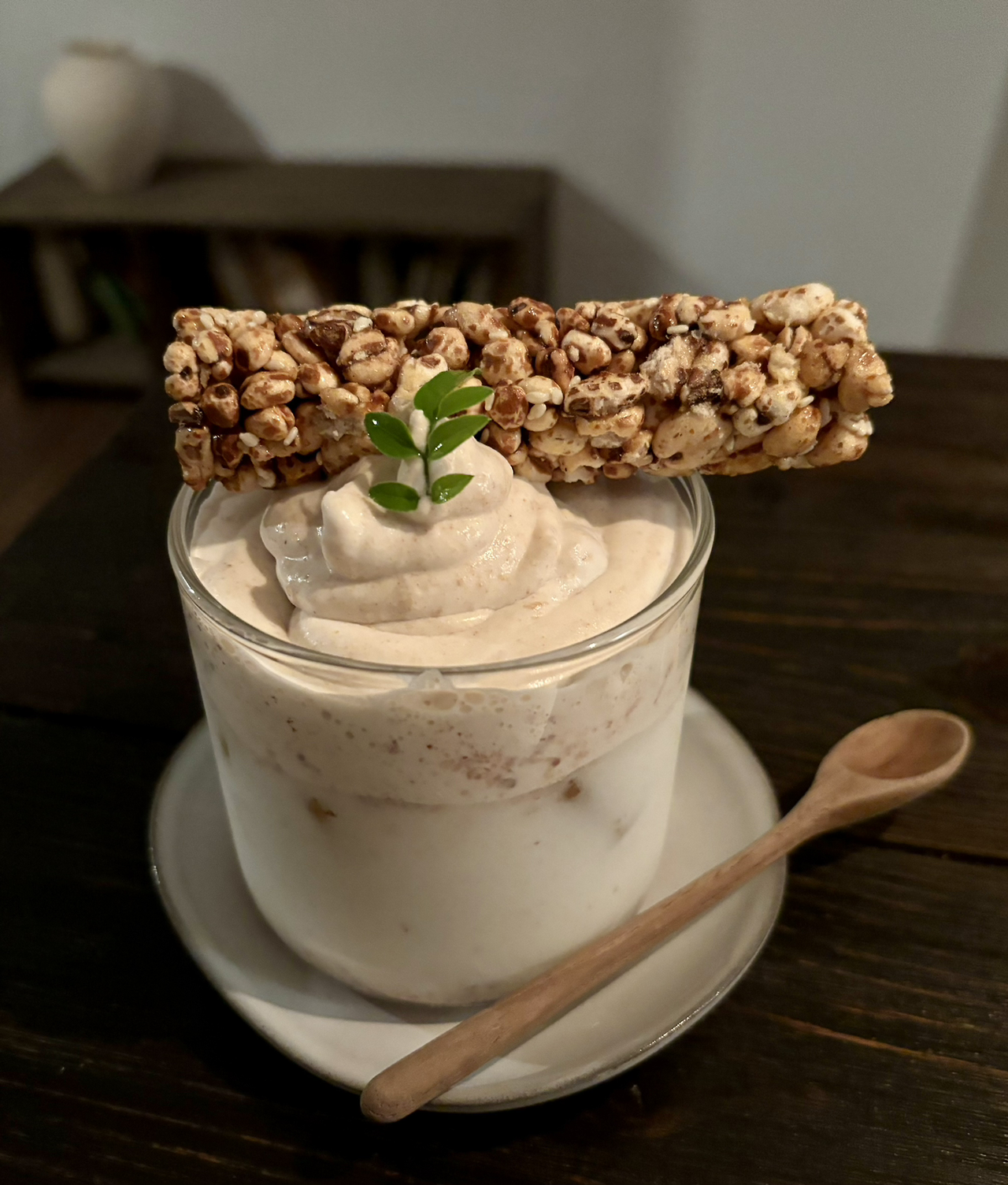 곧이어 사장님께서 간단한 설명과 함께 직접 보리라떼를 전해주셨다. 누구나 그렇듯 궁금한 음식이나 음료 앞에선 각자의 신중한 태도가 있을 것이다. 나는 대게 그렇다. 음식이 나오고 나면, 먼저 '보고', 그다음 '맡고', 이어서 '머금고', 마지막으로 '느끼는'것 까지가 나의 태도이다. 향에서 느껴지는 보리와 곡물이 섞인 듯한 연하지만 깊은 향, 되게 부드럽고 묽은 보리크림이 보리의 향을 더 받아들이고 라떼와 조화를 이룰 수 있게 도와주었고, 마지막으로 목구멍에 삼킨 뒤 콧구멍으로 새어 나오는 날숨에 고소한 보리향이 가득하여 기분 좋은 미소를 지었다.