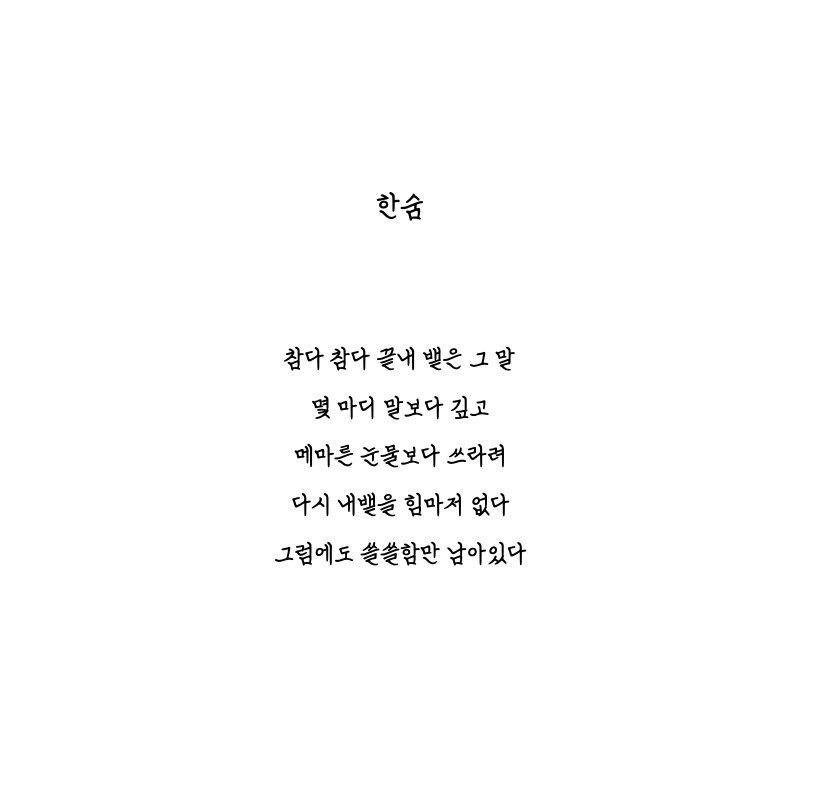 여러분은 알고 계신가요, 누군가와 함께 있을 때와 혼자 있을 때 내쉬는 한숨이 다르다는 것을요. 아무래도 곁에 누가 있다면 깊은 한숨을 맘 편히 내쉴 수는 없겠지요. 그러면 한숨이 다 같은 한숨이지 깊은 한숨은 뭘까요. 가끔 주변 사람들을 관찰해 보면 습관적으로 한숨을 내뱉는 사람을 발견할 때가 있어요. 생각보다 한숨 소리는 주변에서 잘 들리는 거 같아요. 그만큼 세상 살기가 어렵다는 얘기겠죠. 여러분은 반복되고 지겨운 출근길과 정신없이 시달리고 난 퇴근길 중 언제의 한숨이 더 깊으신가요?