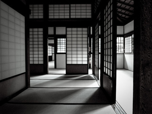 빛은 건물 안으로 바로 들어오지 않고 어두움의 통로를 지나 들어온다. 비와 여름의 햇빛과 비을 피하기 위해 드리운 긴 처마가 만드는 어둠, 첩첩의 문으로 둘러싸여 생기는 어두움을 지나 빛은 옆에서 비스듬히, 밑에서 반사되어 들어오기 때문에 희미하고 은근하다.