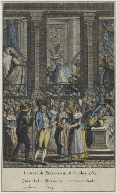 그런데 또다시 분노할 일이 생깁니다. 계속 치솟는 물가 때문에 여전히 한 끼도 제대로 먹지도 못하는 일이 다분한데, 베르사유에서 큰 파티를 벌였다는 소식이 들리자, 화가 난 파리의 평민 여자들이 가족들을 데리고 베르사유로 가, 궁을 둘러싸고 시위를 벌이면서, 왕과 왕비가 파리로 오길 요구를 했어요. (1789년 10월 5일)