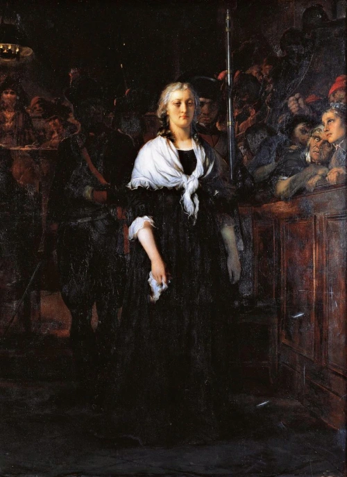 8월 1일 앙투아네트는 콩시에르쥬리 감옥으로 옮겨지는데, 그녀가 지내게 될 곳은 빛이 잘 들어오지 않아 춥고 어두운 것은 물론이고, 습기가 가득해 눅눅하고 축축했죠. 그리고 과부 카페가 아닌 죄수 280으로 불리며 완전한 죄수 취급을 받게 됩니다. 10월 14일, 마리 앙투아네트의 처벌에 대한 재판이 열립니다. 얼마나 스트레스를 받았는지 머리가 모두 흰 채로 들어왔다고 합니다. 당시 그녀를 변호해 주는 변호사가 있었지만, 재판소는 그에게 변론을 준비할 시간을 거의 주지 않았죠. 왕비는 오스트리아와 내통 (그녀가 친정 가족들에게 안부인사와 근황을 전하며 보냈던 편지들까지 내통 증거로 채택하는 억지스러운 모습을 보여줍니다.), 국고 낭비, 전쟁 유발, 근친상간 혐의를 받게 되는데, 그녀는 다른 죄들을 언급할 때는 아무 말 없이 담담하게 있었으나, 근칭상간 죄에 대해서는 그곳의 어머니들에게 호소를 하였고, 이에 마음이 움직인 여자들은 마리 앙투아네트를 위로하며 말도 안 되는 죄에 대해 비난을 하였습니다. (엘리자베트 또한 루이 17세가 학대로 인해 고모가 자신을 성폭행했다고 증언하여, 근친상간 혐의를 받게 됩니다.)