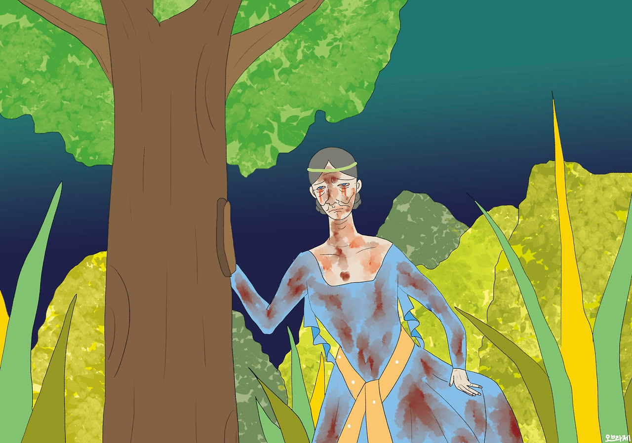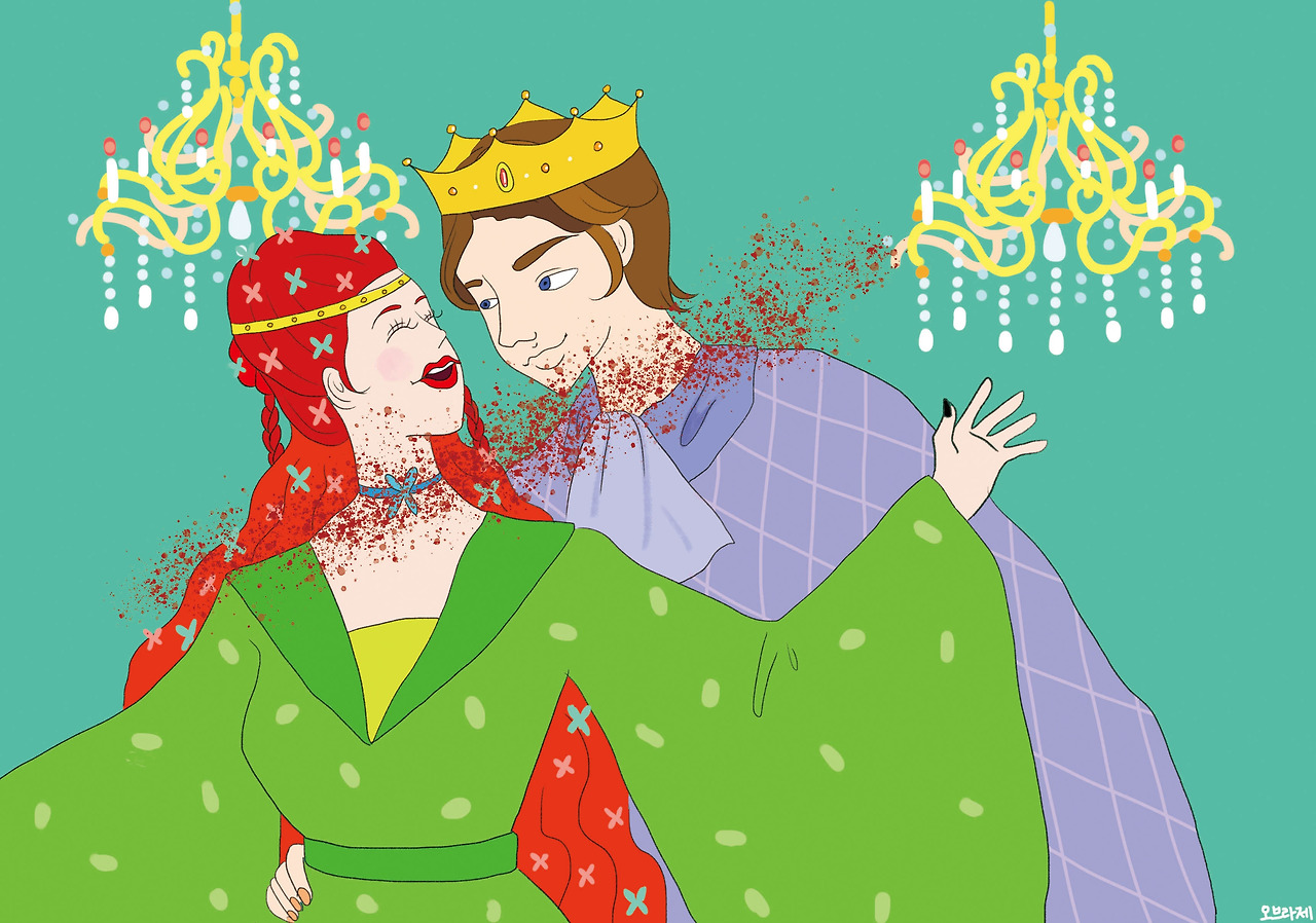 왕은 “왕비 많이 놀랐소? 이제는 다시 돌아오지 못하도록 할테니 걱정 마시오.”라며 마녀를 위로해 주었습니다. 그리고 둘은 파티를 이어나갔죠. 왕궁이 보이지 않을 정도로 뛰쳐나온 언니는 자신이 동생에게 했던 말이 떠올랐습니다. ‘그래, 혹시 모르잖아. 살가죽을 벗기면 다시 젊어질지도.’ 그녀는 그렇게 대장장이를 찾아갔고 자신의 드레스에 붙어 있는 보석을 떼어내 부탁 했습니다. “허, 참나 왜이리 이상한 부탁을 하는 사람들이 있는지. 내가 돈만 아니었어도 부탁을 들어주지 않았을 거야.”그녀는 출혈과 고통을 감수하고서라도 젊어지고 싶었지만 살을 도려내던 도중 동생과 마찬가지로 과다출혈로 사망했습니다.