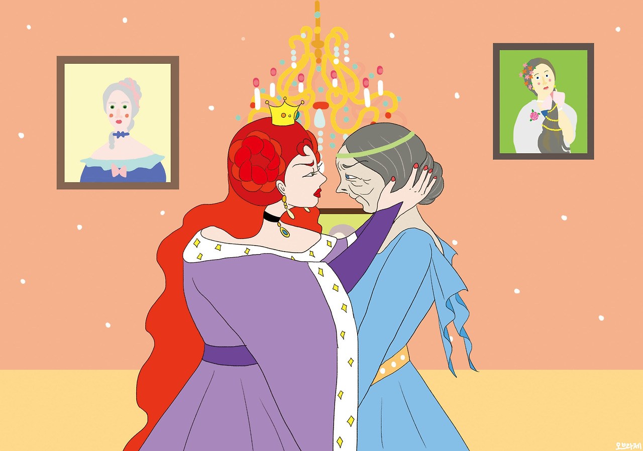 그날 저녁 동생은 낮에 있었던 일을 언니에게 말했습니다. 그 말을 들은 언니는, “그분, 폐하이실 거야.”라고 대답했습니다. 놀란 동생은 “폐하라고? 이 나라에 왕이라는 거야?”라고 물으니. “그래, 오늘 이곳을 지난다는 소문을 들었거든. 아마 네 목소리에 이끌려 이곳으로 오신 거지. 그것도 모르고 얼굴을 보면 실망한다는 바보 같은 말을 하다니.” 동생은 헛웃음 치며 ”나이 먹은 할머니를 무슨 이유로 관심을 보이겠어.”라고 대답을 했습니다. 하지만 언니는 눈이 반짝 빛나며 물었습니다.