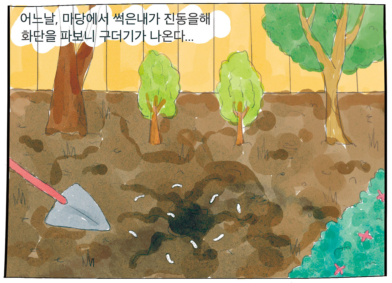 새로운 집에 집들이를 하던 어느날, 마당에서 썩은내가나 파보니 구더기가 나온다.