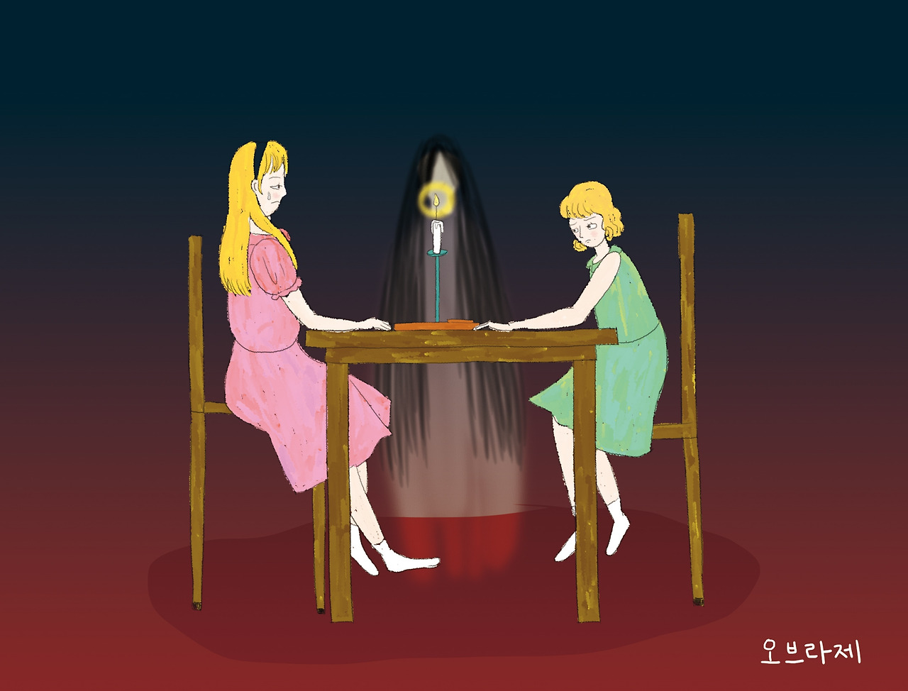 1. 위자보드를 펼친 후 두사람이상이 마주 앉습니다. (이때, 모든불을 끄고 촛불이나 스탠드 같은 작은 불빛이 될 만한 것을 켜라는 말도 있습니다. )