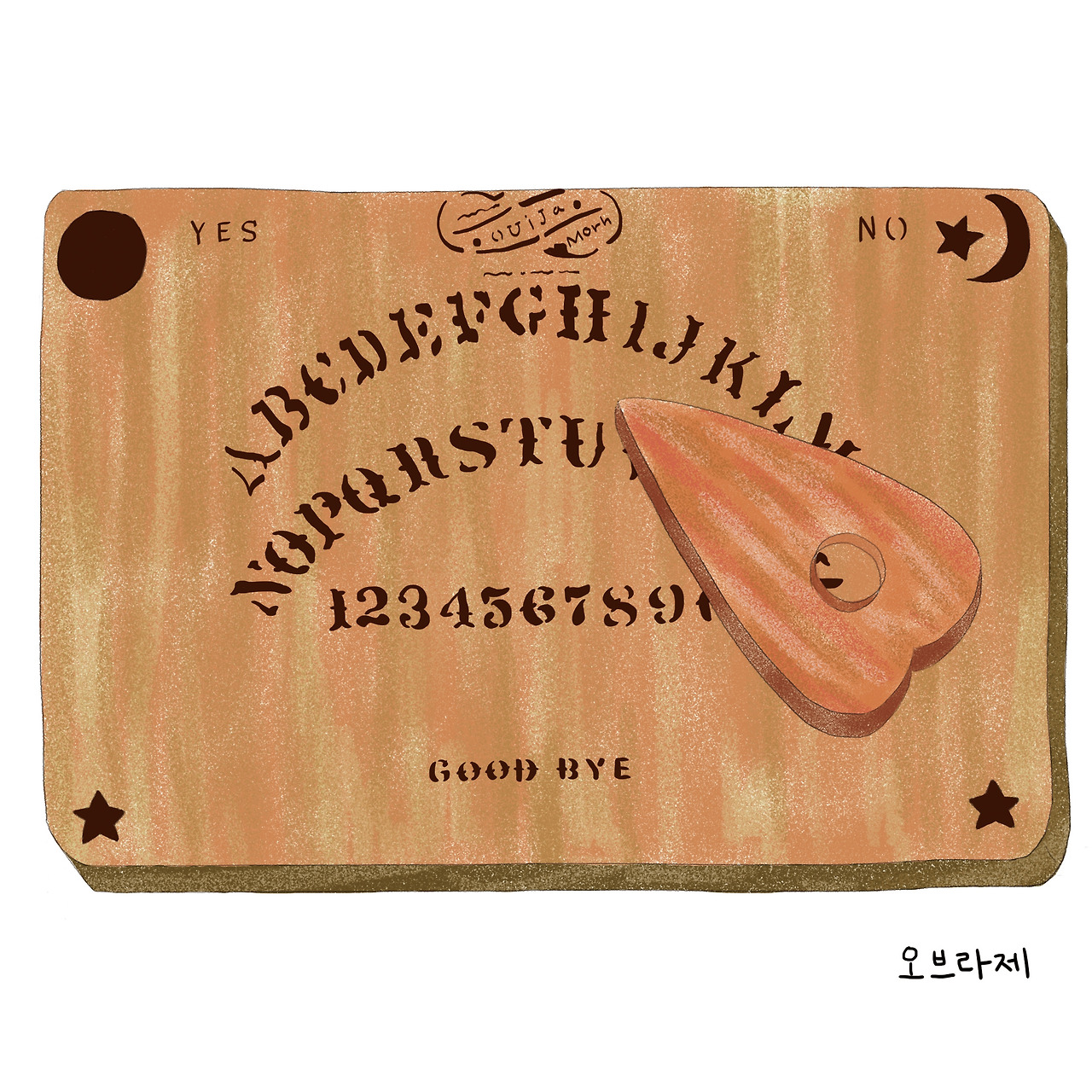 위자보드 (Ouija Board) 라는 이름은 간혹 미국에서 만들어진 게임이라 영어라고 생각을 하시는 분들이 종종 계신데, 사실은 Oui는 프랑스어, ja는 독일어로, 둘다 “예”, “yes”라는 뜻을 가지고 있습니다.