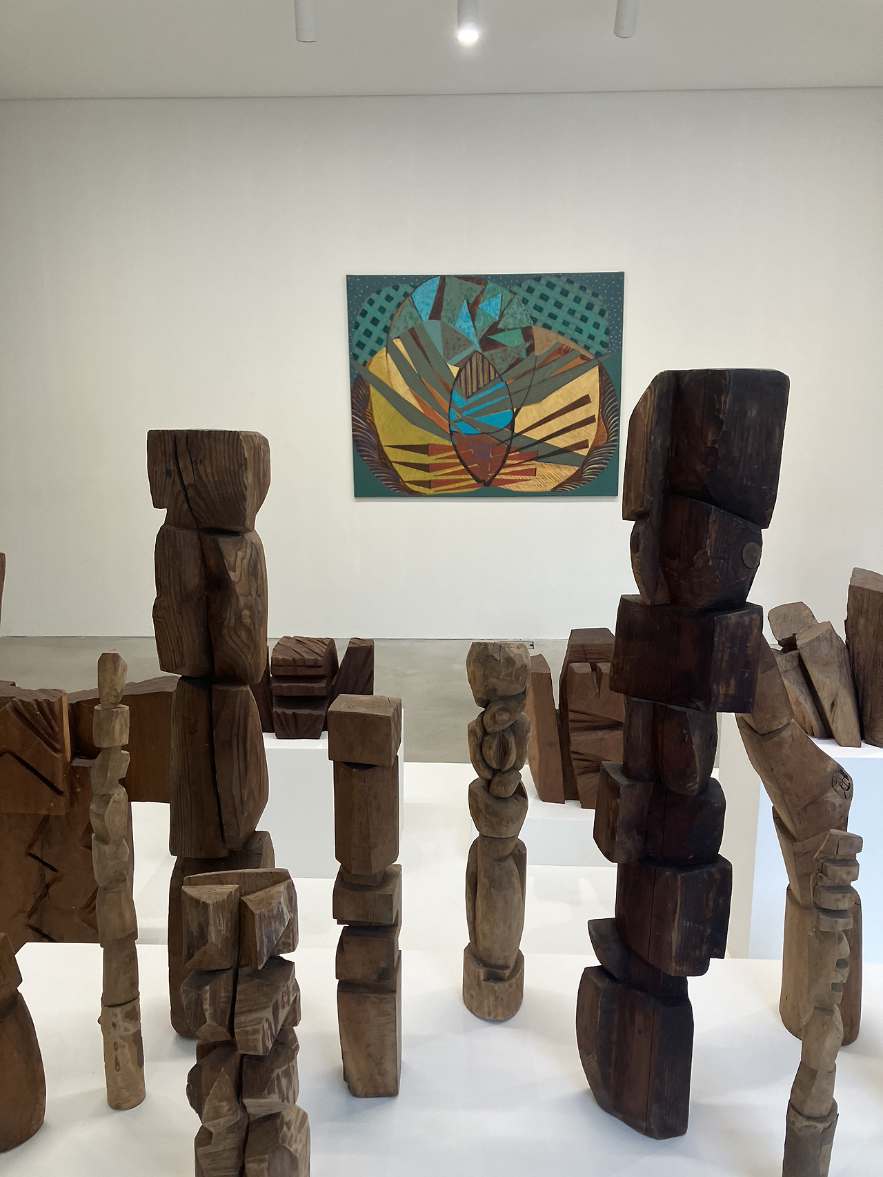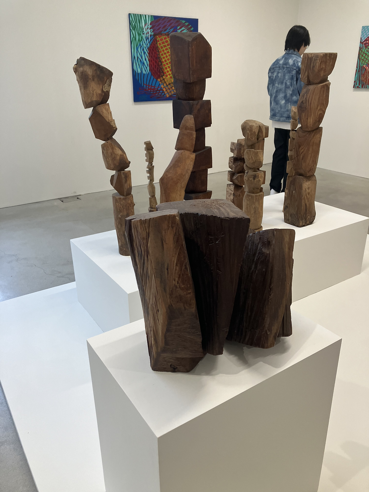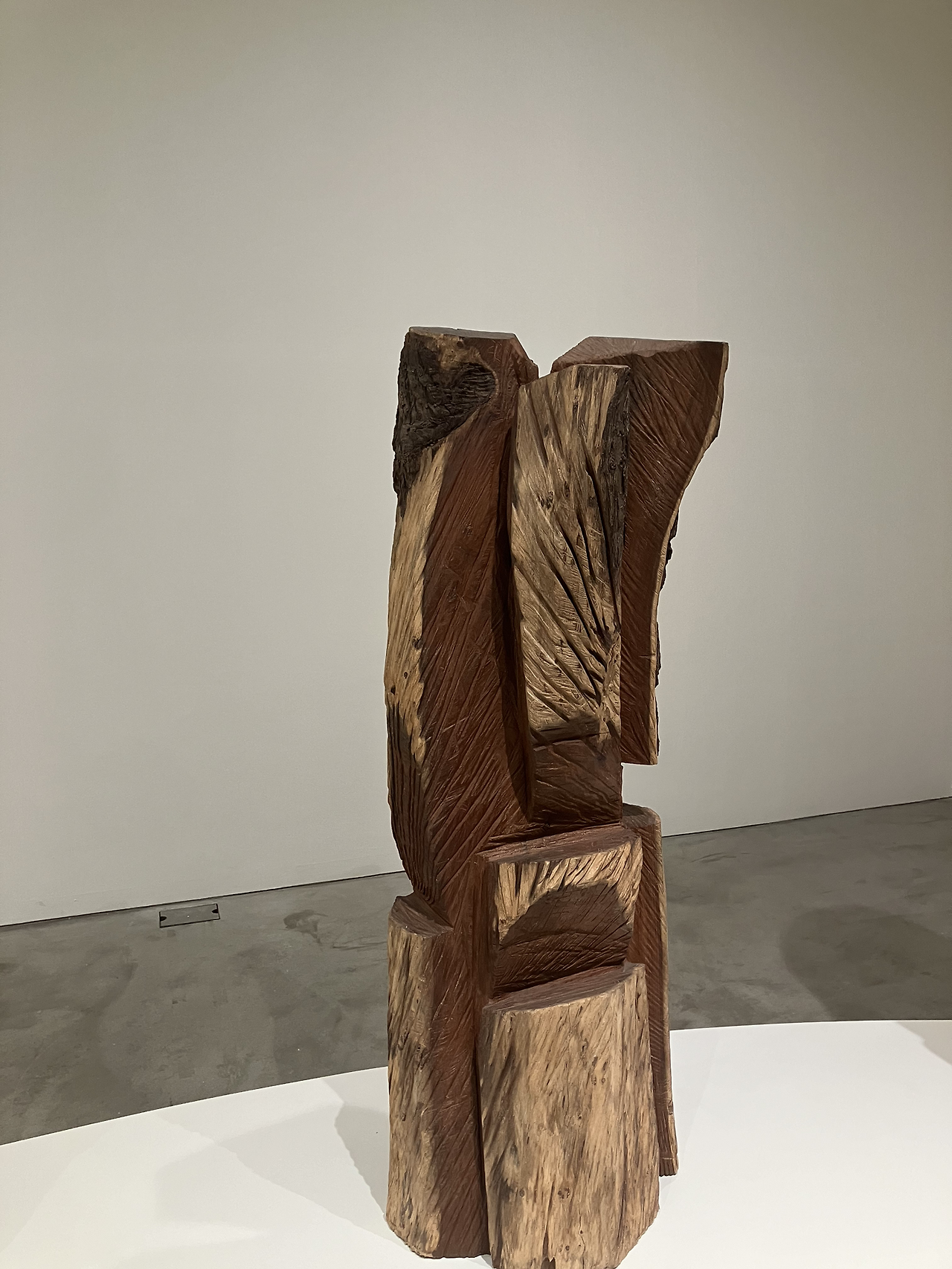 나무의 나이테, 결, 색깔을 고스란히 살려 현대 전시장에 데려다 놓으니 이보다도 원시적일 수가 없다.