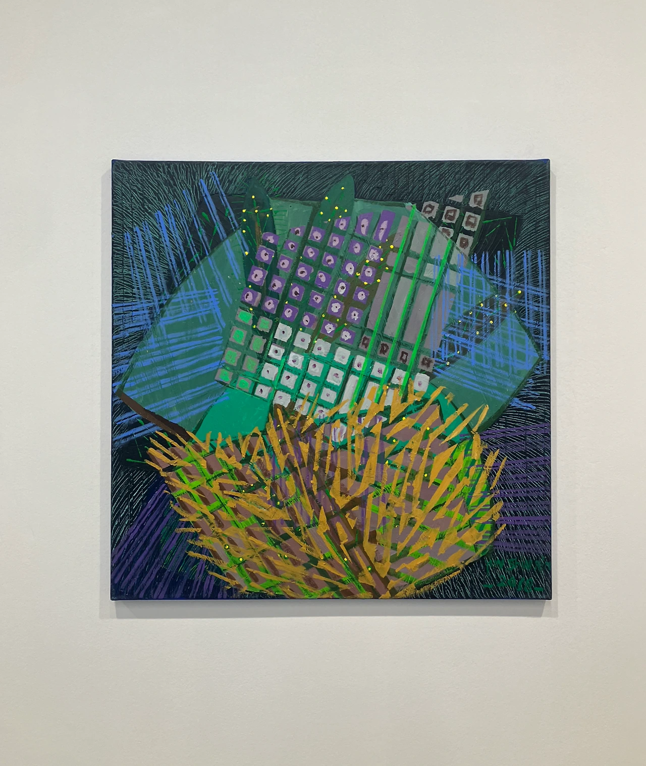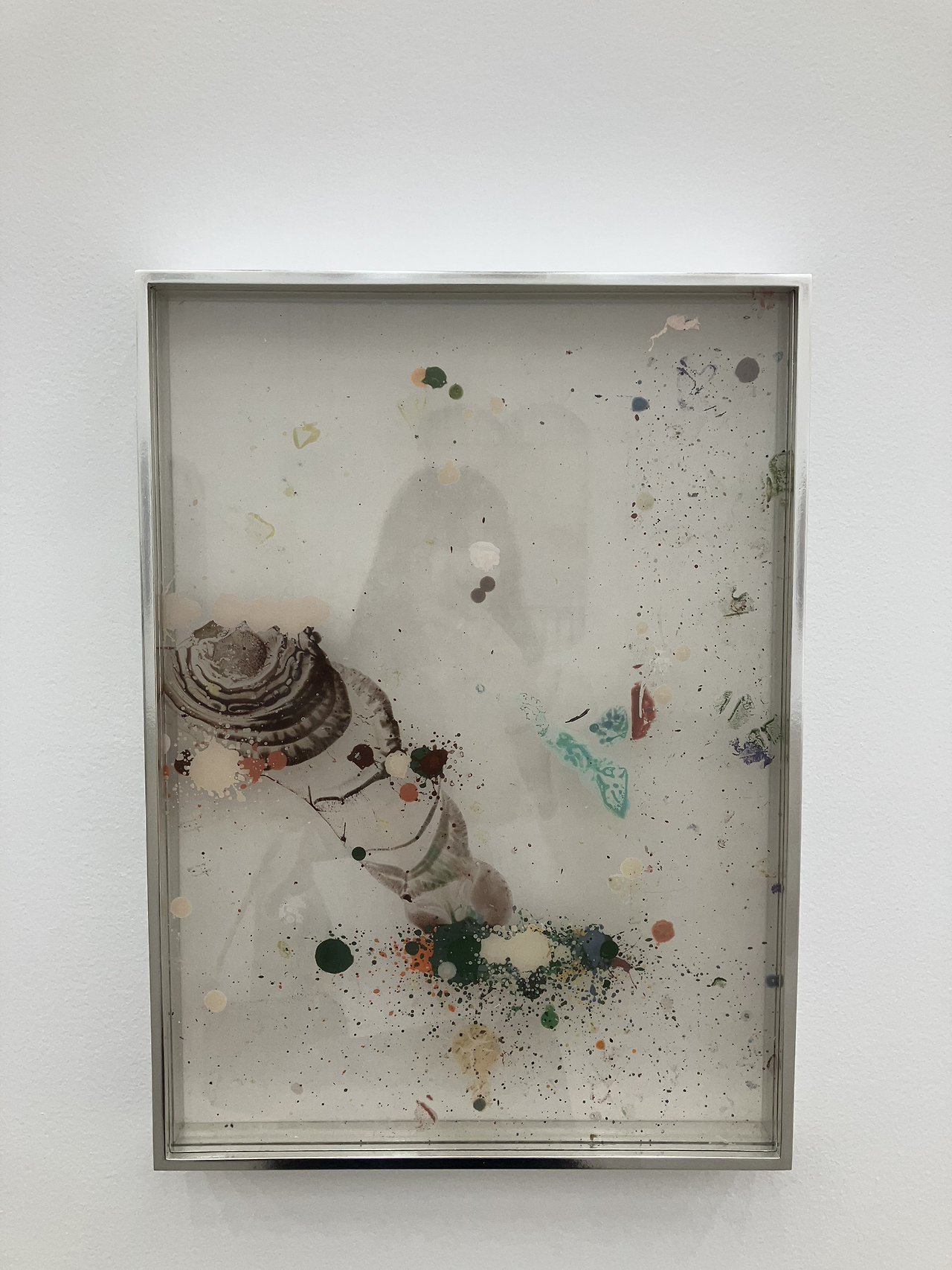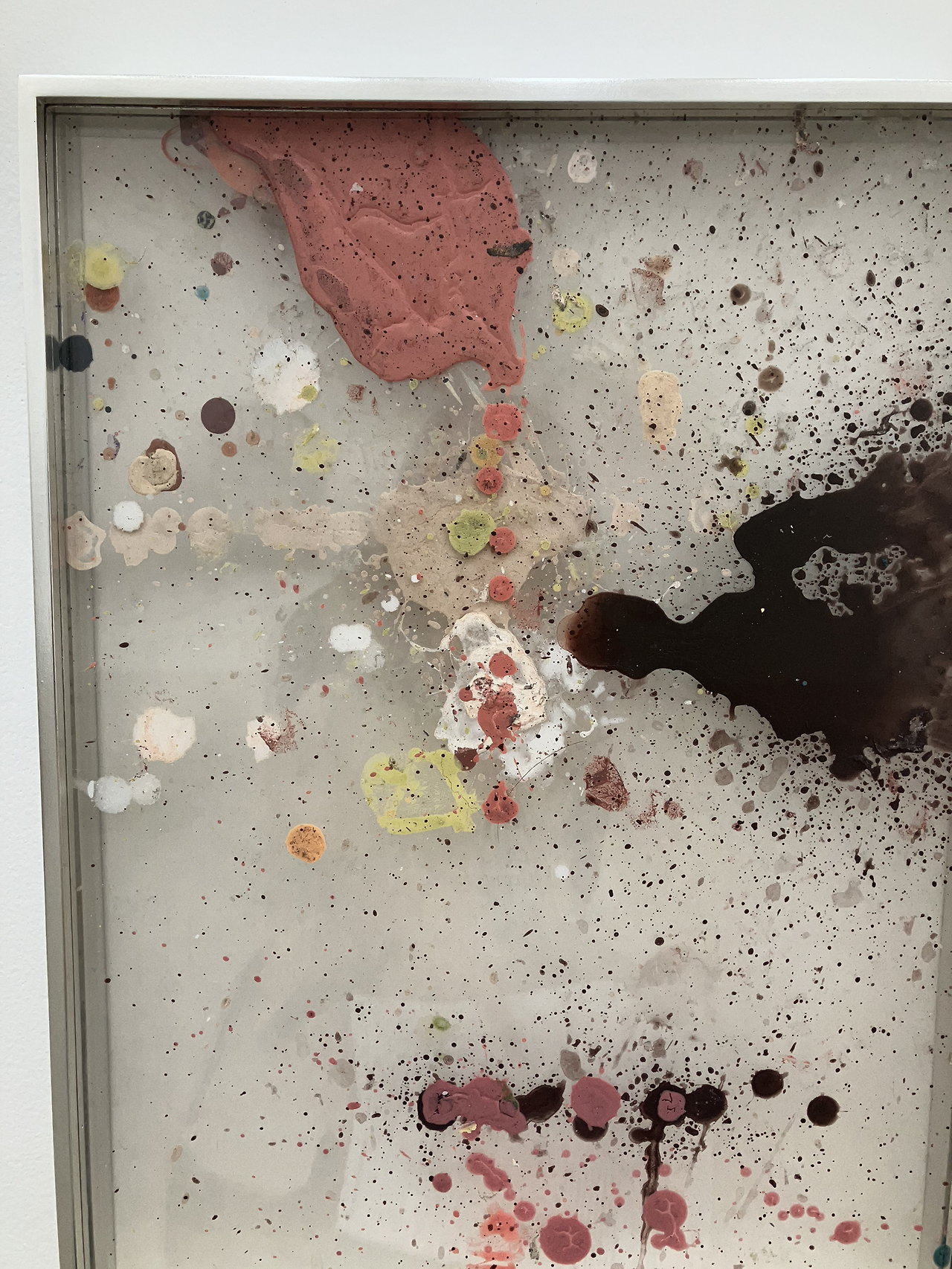 물감을 흩뿌린 판 여러 개를 겹쳐 만든 작품.