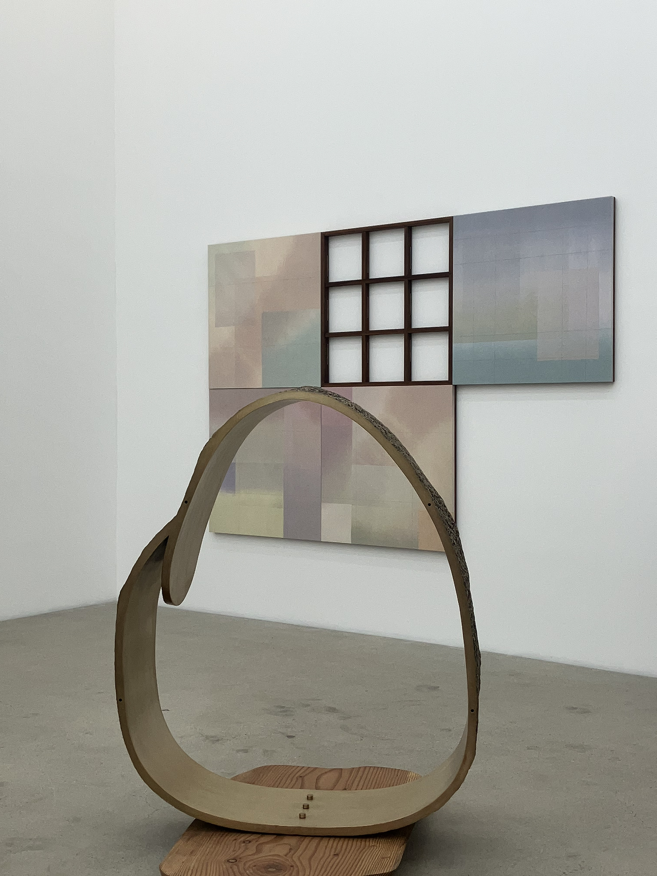 이 시공간을 담는 다양한 목재 프레임 위에 비단의 층위를 덧대어, 일상 속 시간의 축적을 표현했다.