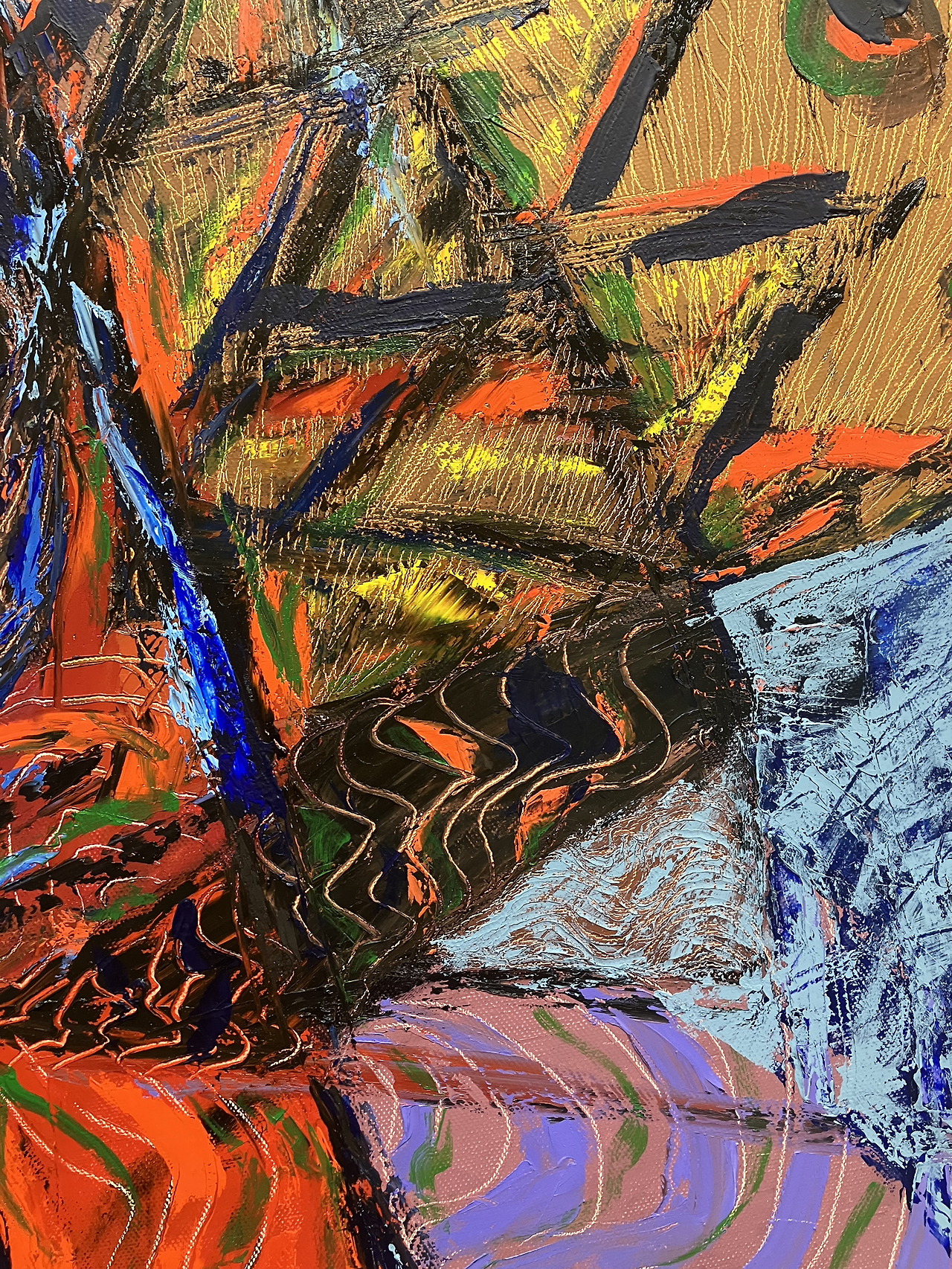 물감을 칼로 긁어 거칠고 자유로운 원시적 느낌을 살려냈다.