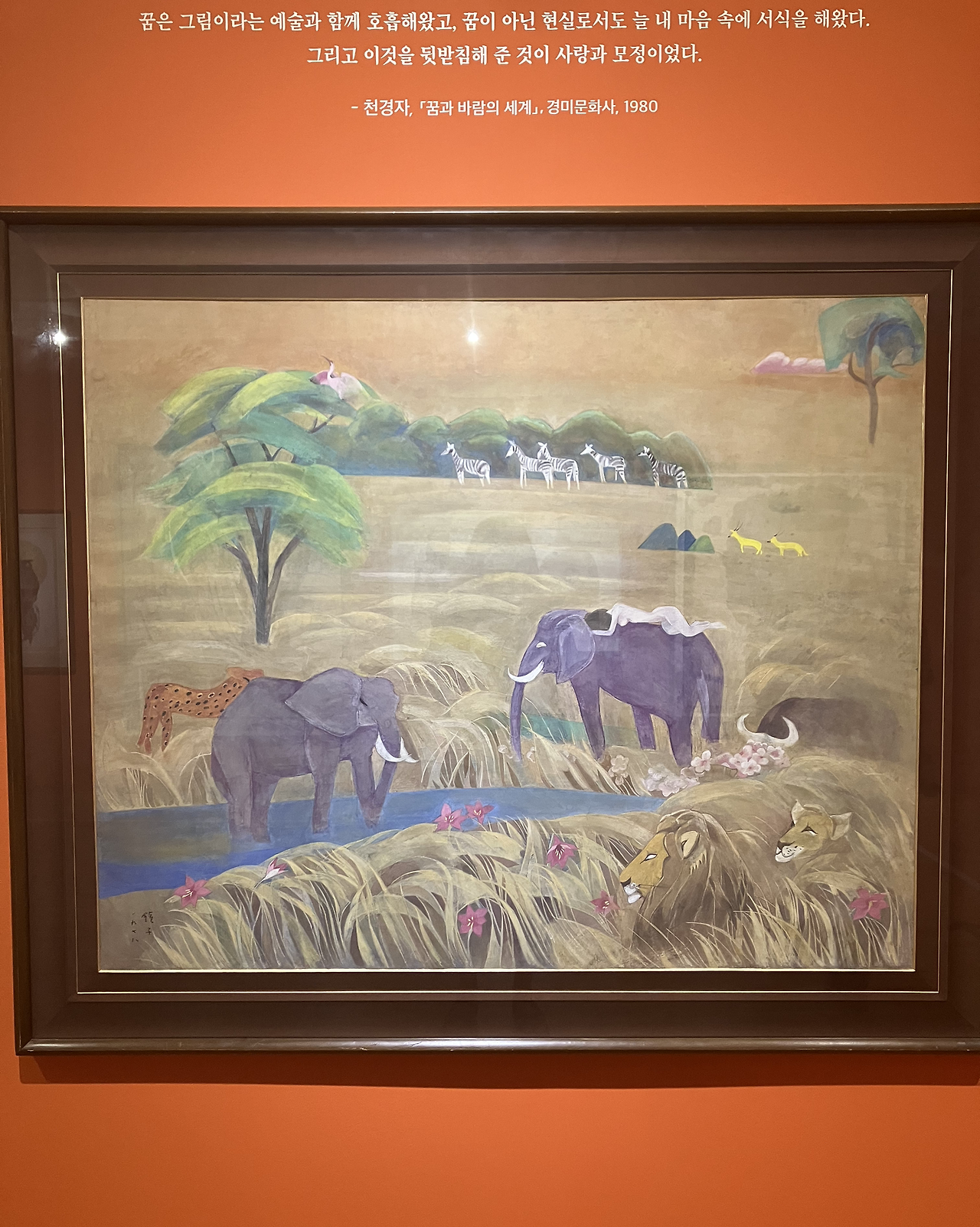 특히 코끼리를 보랏빛으로 칠한 것이 인상 깊었다. 보통 떠올리는 코끼리는 회색이기 마련인데 천경자 화백은 보랏빛으로 그렸다. 맞아 생각해 보니 코끼리는 회색빛 하나가 아니라 이렇게 푸른 보랏빛도 섞여 있었던 것 같아- 하고 즐겁게 깨달았다.