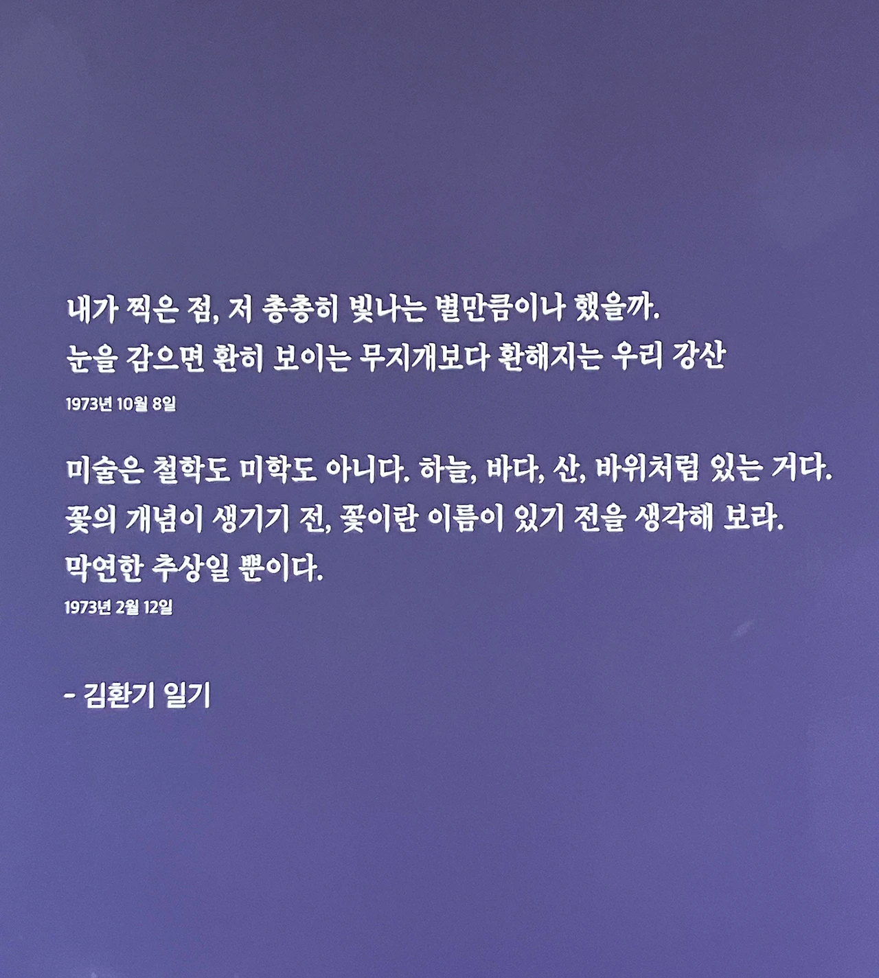 본 전시에는 선이 강조된 작품들 위주이나, 색감과 붓질로 사색을 유도하는 작품이 보고 싶다면 환기 미술관을 방문해 보길.