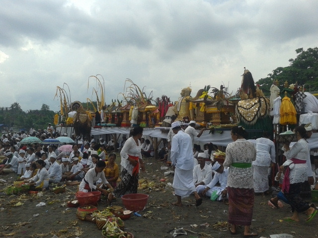 새해 전날 횃불과 함께 행렬했던 그 많은 '오고 오고’ 들은 어떻게 됐을까? 어디로 갔을까? 상상이나 했을까. 몇 달을 걸쳐 만든 '오고 오고' 작품들은 녀삐 맞이 축제와 의식이 끝난 바로 그 날, 불 태어졌다고 한다. 나쁜 기운과 영은 '오고 오고'와 함께 활활 타는 불속으로! 녀삐와 관련된 의식을 하나 더 덧붙이자면, 새해를 맞이하기 3-4일 전, 마을 사람들 전체가 흰 전통의상을 입고 대나무 줄기로 엮어 만든 깃발과 함께 바다에 모두 모인 날이 있었다. ‘멜리스(Melis)’라고 부르는 의식인데 ‘신성한 물’이라고 생각하는 바닷물로 얼굴이나 몸을 적시면서 한 해 동안 덮여 있던, 신께 용서를 빌고 싶은 기억을 씻어내고 몸과 마음을 정화하는 날이라고 한다.